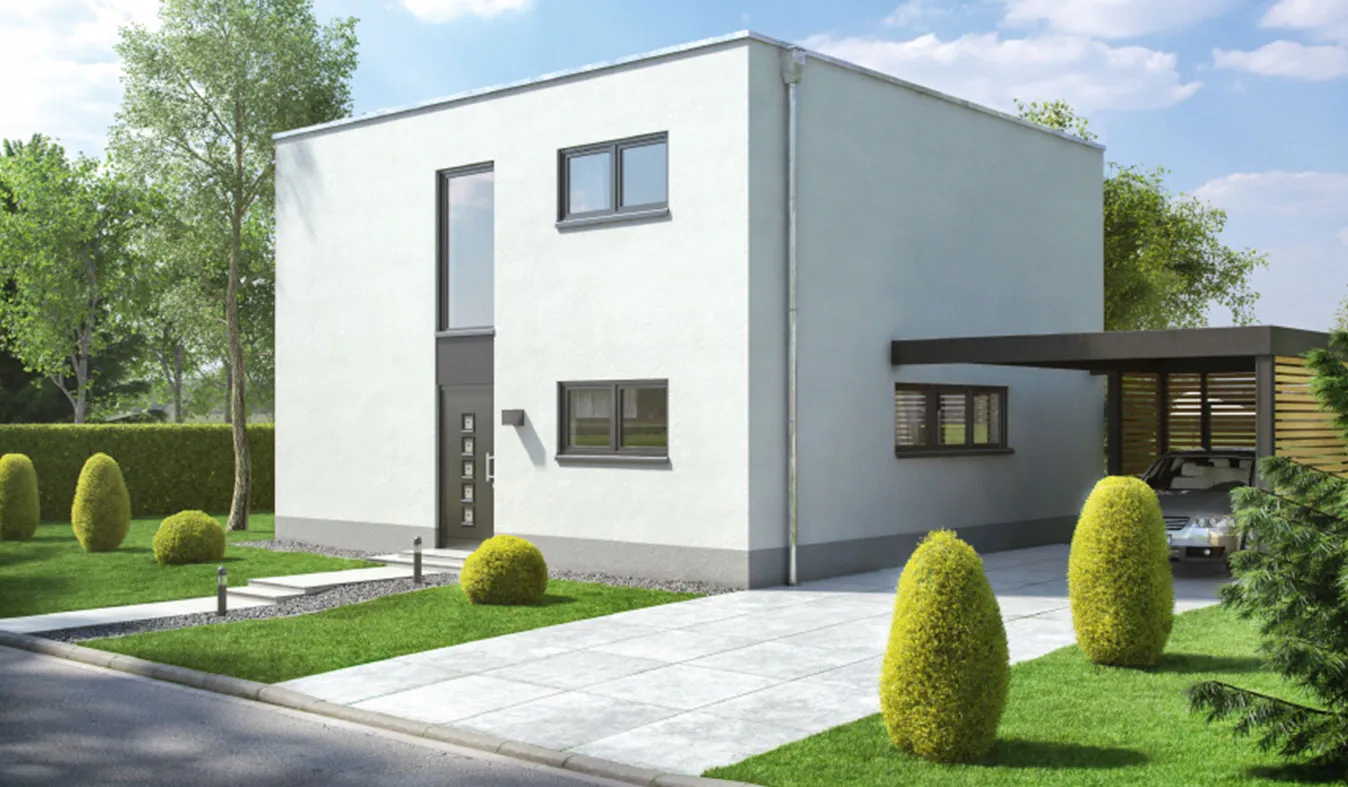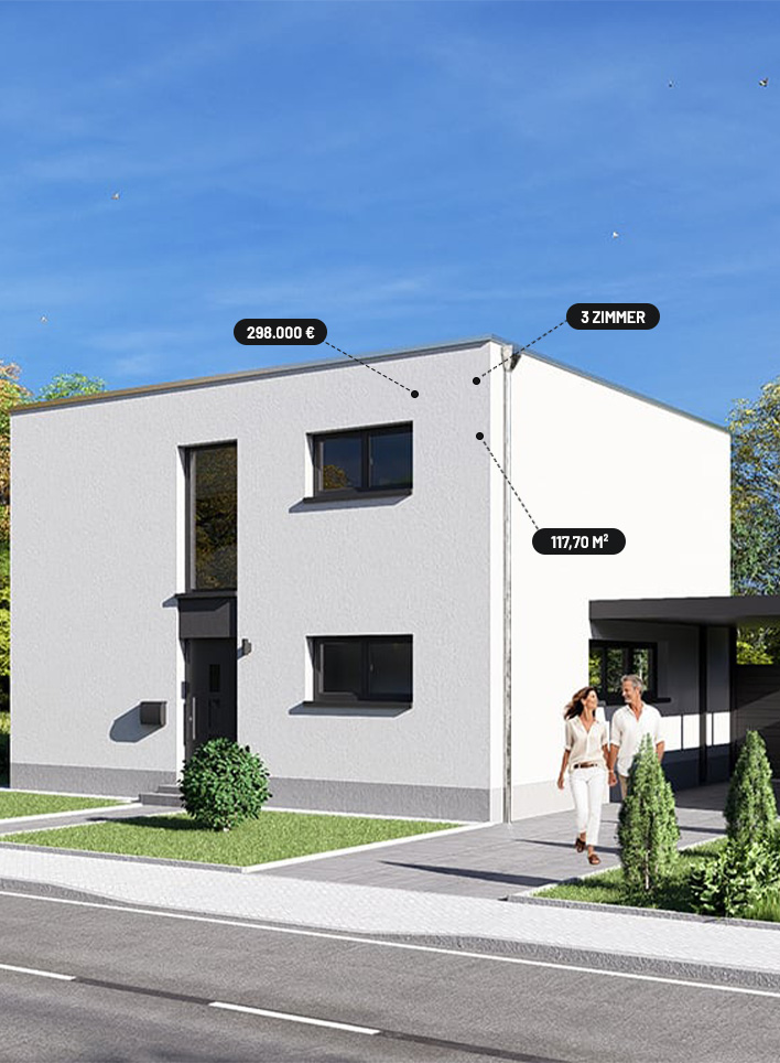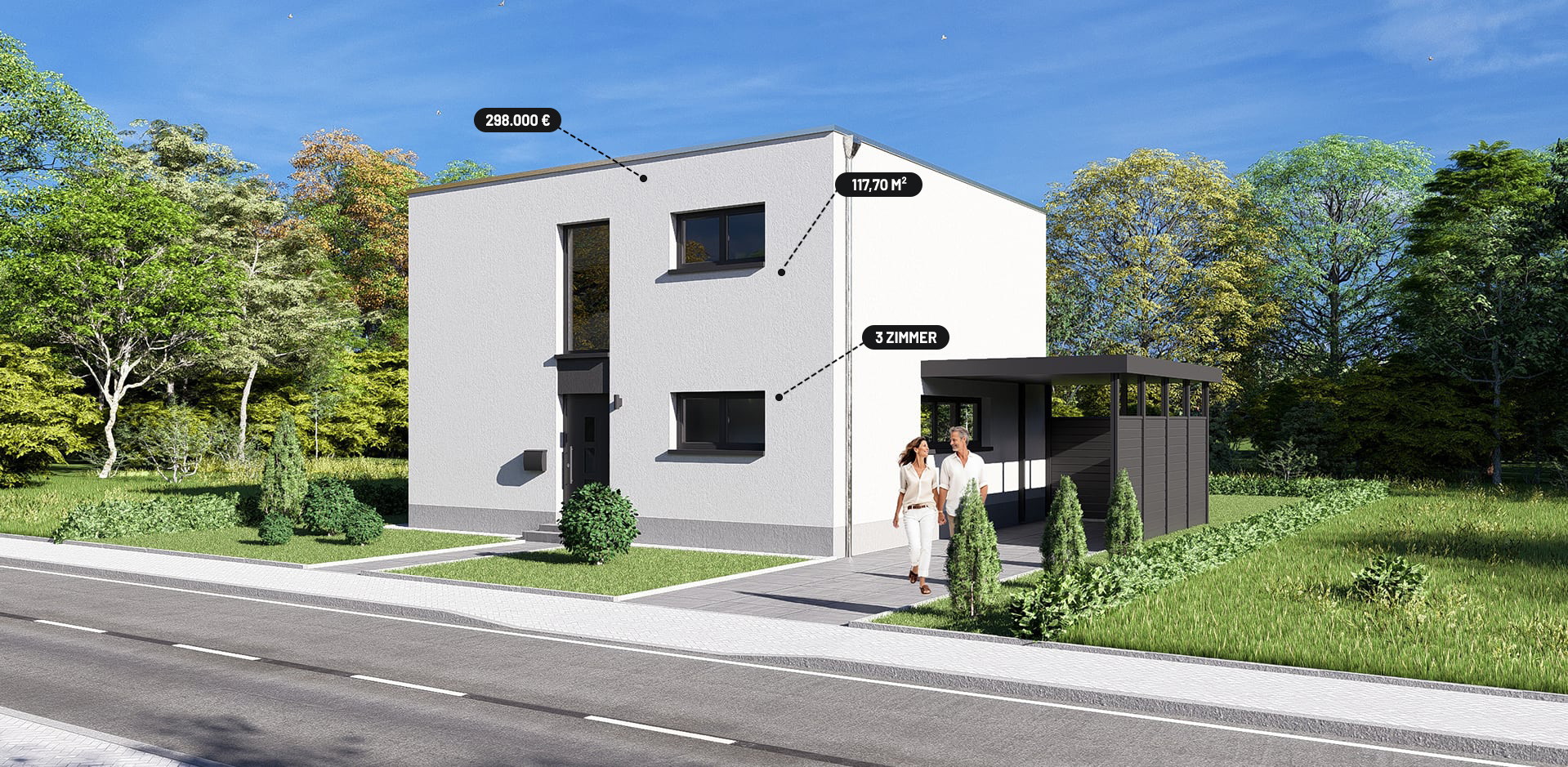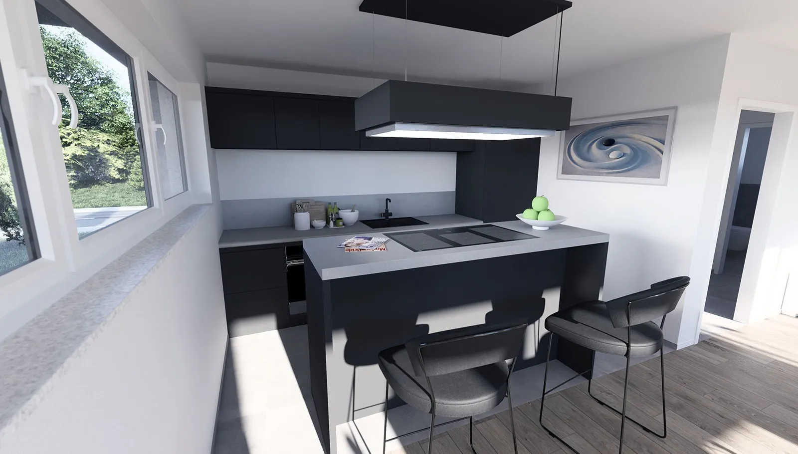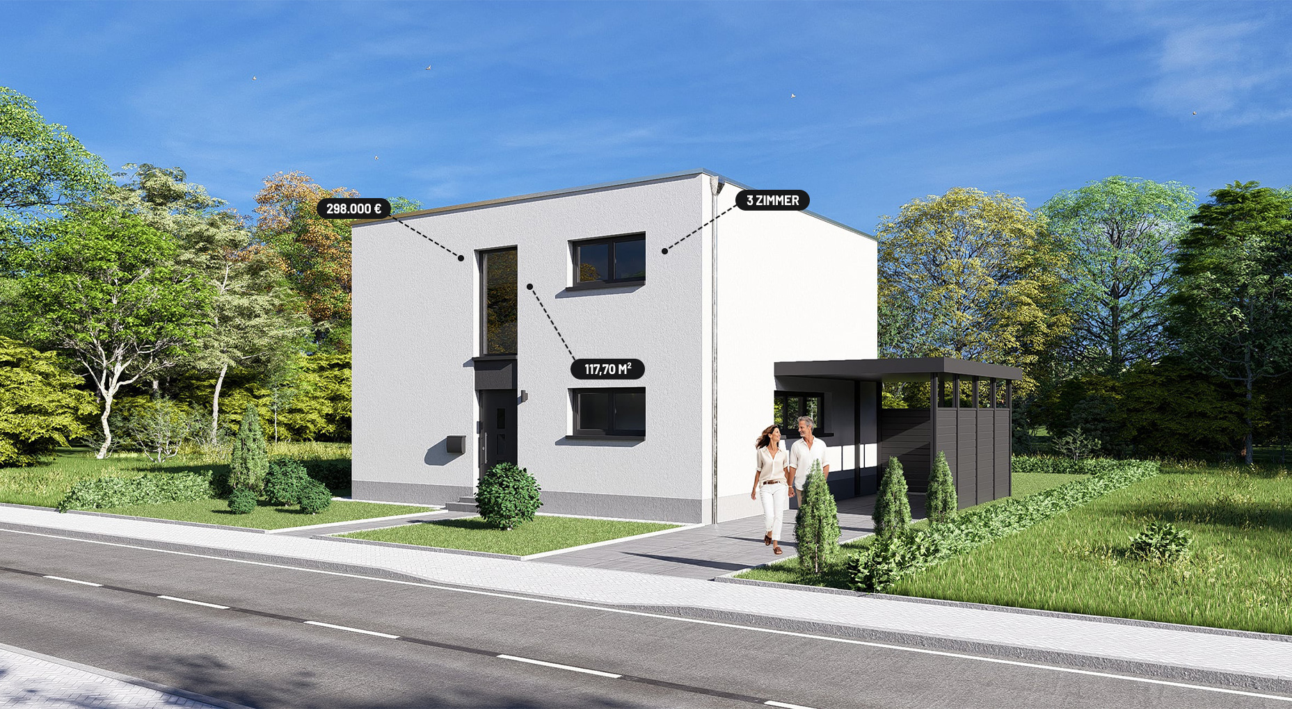 Manchmal ist das Einfache das Besondere. Die kompakte Bauweise mit ihren klaren Linien ist modern, zeitlos und trotzdem auf der Höhe der Zeit. Große Glasflächen und moderne Fenstergestaltung sorgen für Tageslicht durchflutete Räume, die gerade im Erdgeschoss viel Platz für individuelle Wohnträume lassen. Wie zum Beispiel eine moderne Küche mit Insellösung.