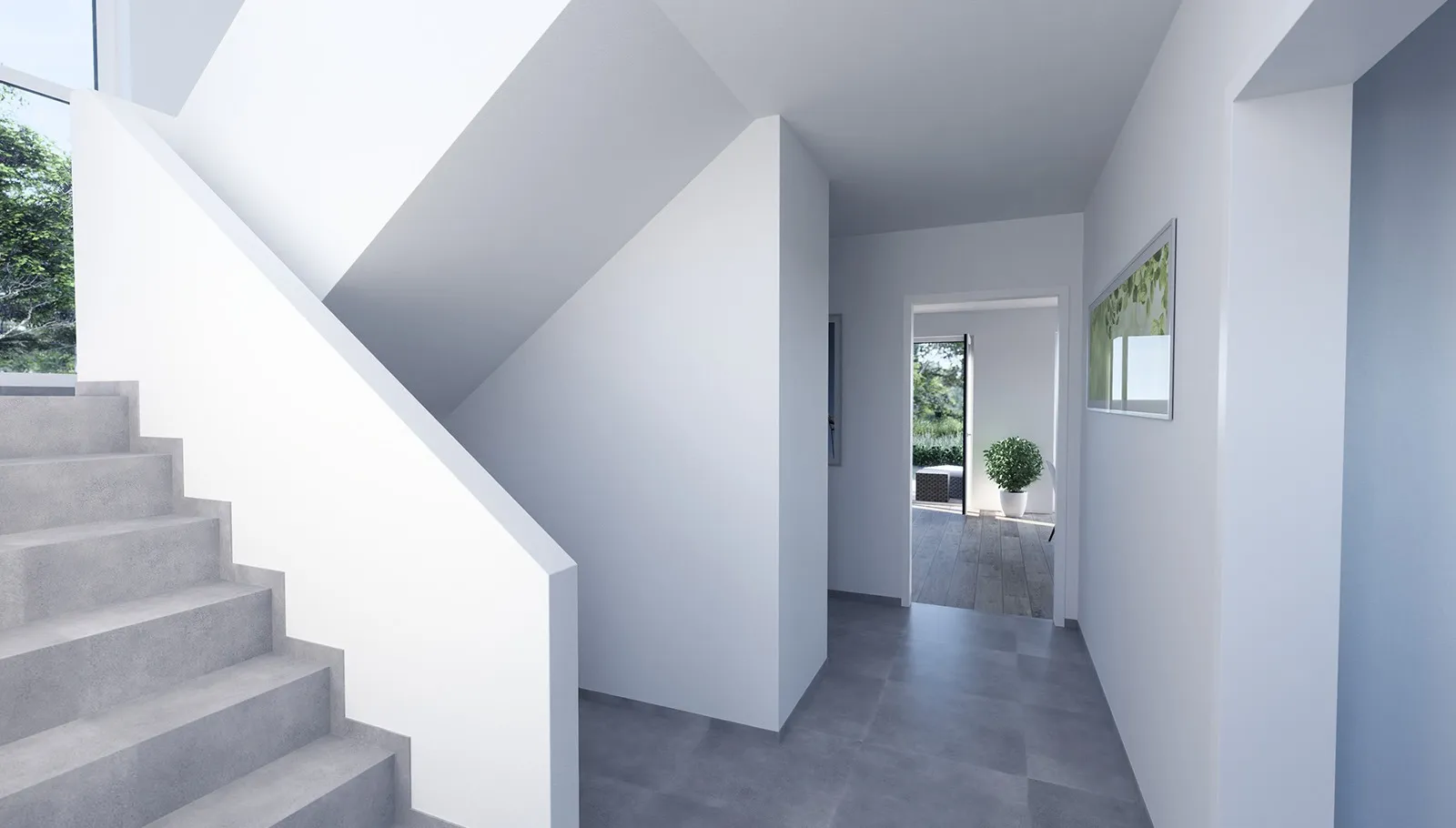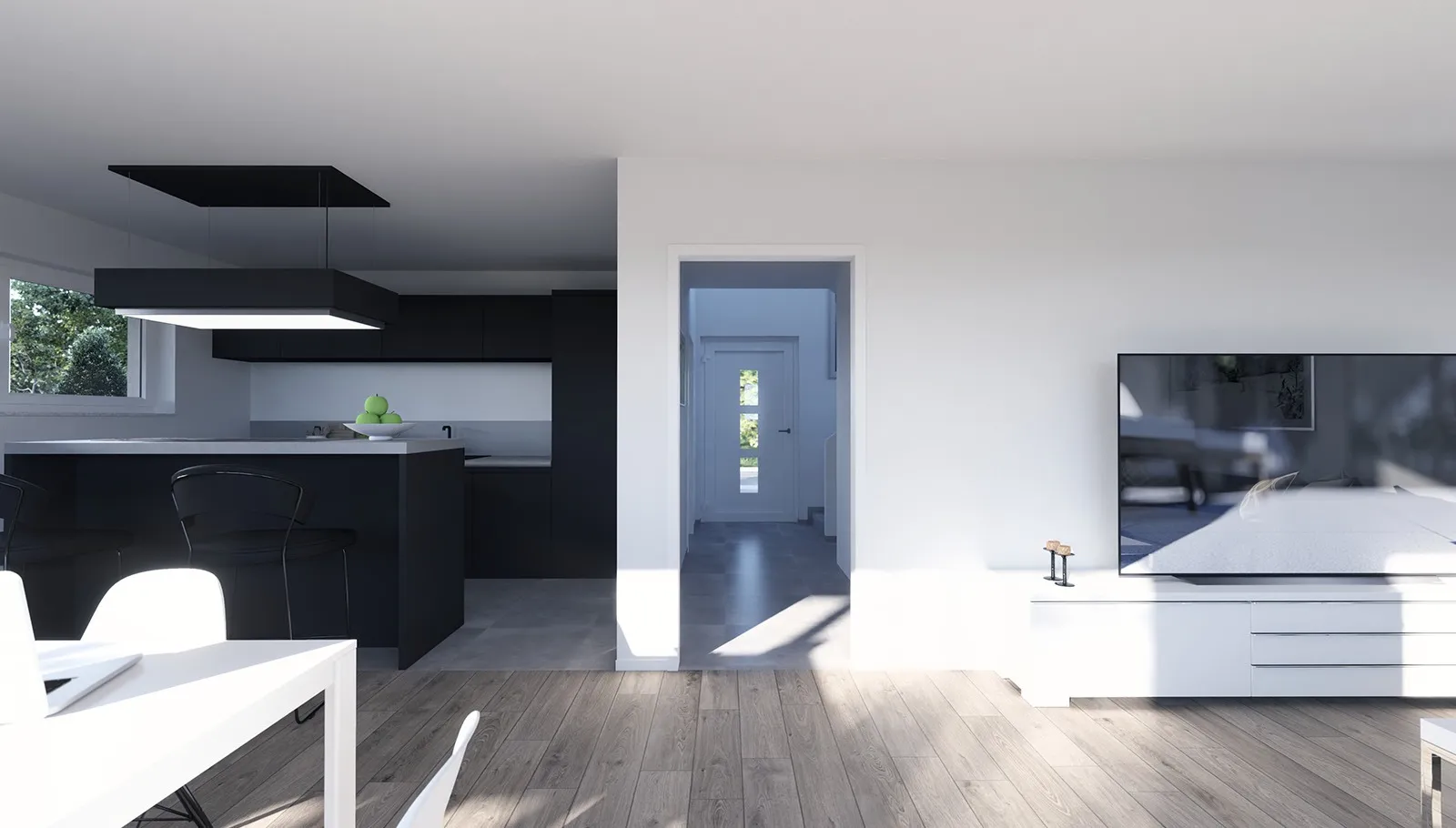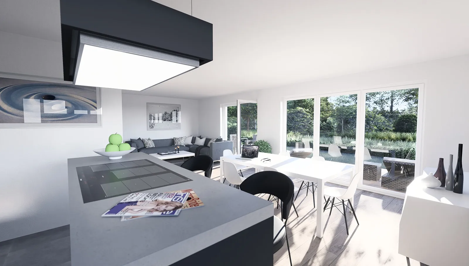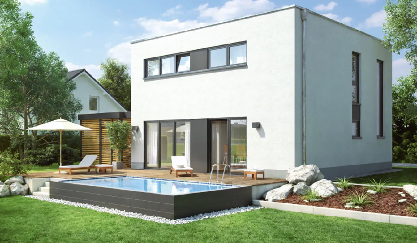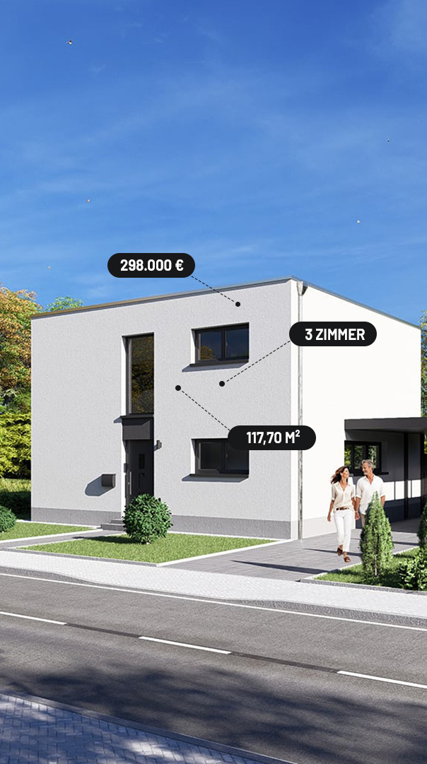 Manchmal ist das Einfache das Besondere. Die kompakte Bauweise mit ihren klaren Linien ist modern, zeitlos und trotzdem auf der Höhe der Zeit. Große Glasflächen und moderne Fenstergestaltung sorgen für Tageslicht durchflutete Räume, die gerade im Erdgeschoss viel Platz für individuelle Wohnträume lassen. Wie zum Beispiel eine moderne Küche mit Insellösung.