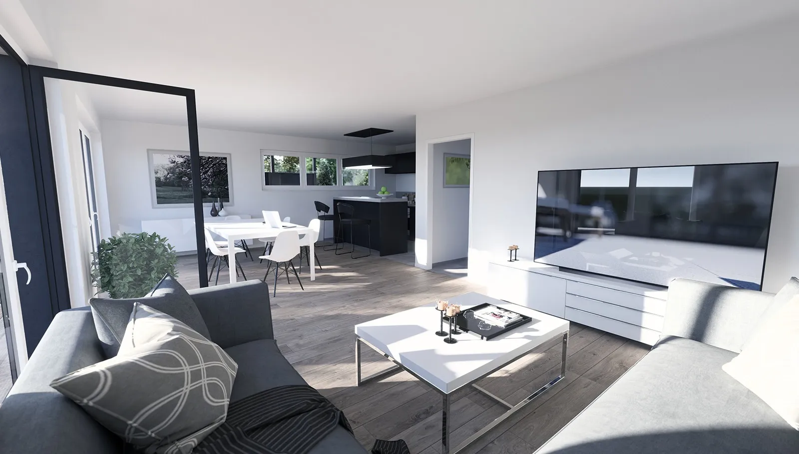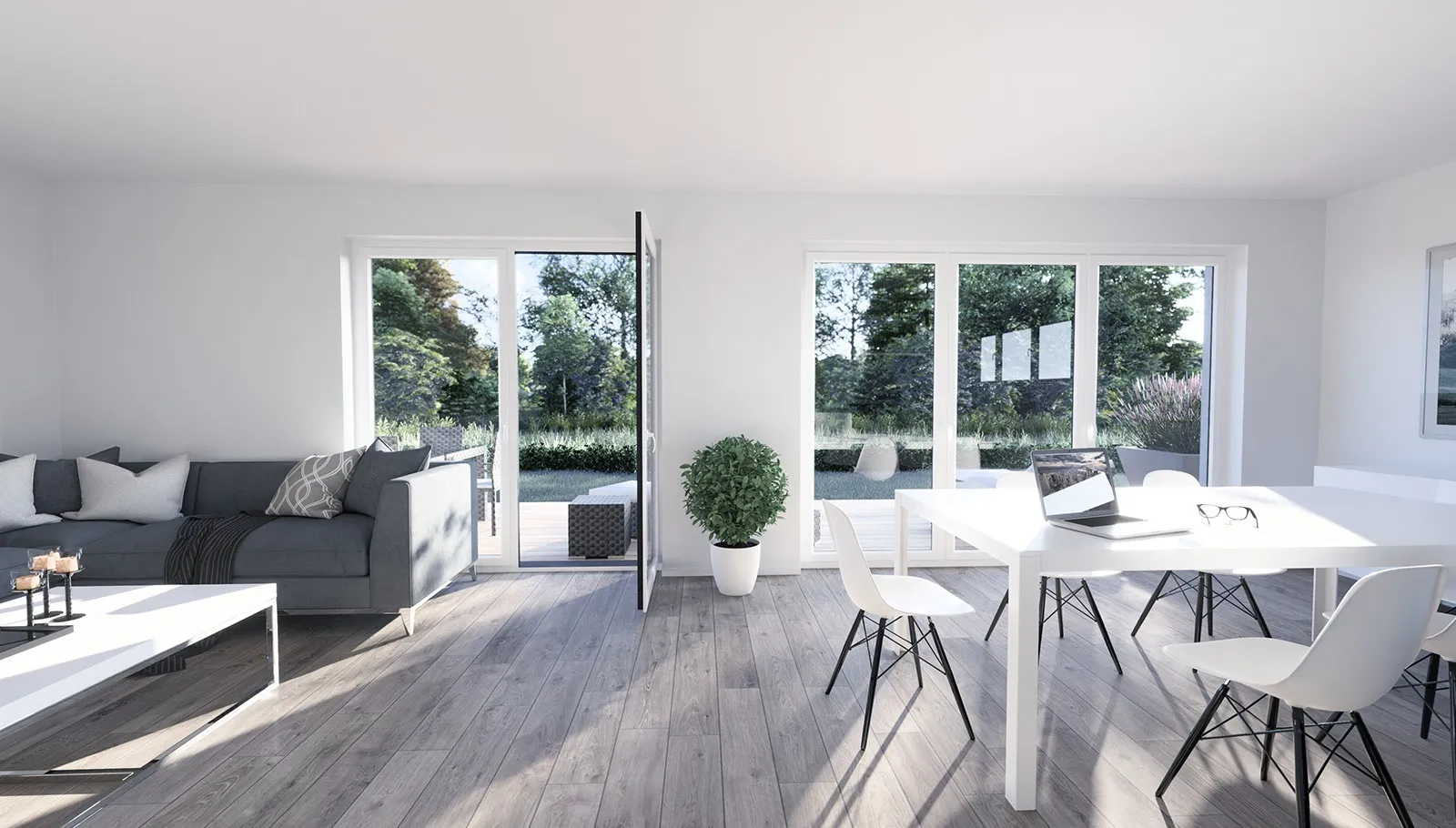 Großzügige Fensterflächen sorgen für viel Tageslicht im Wohnbereich