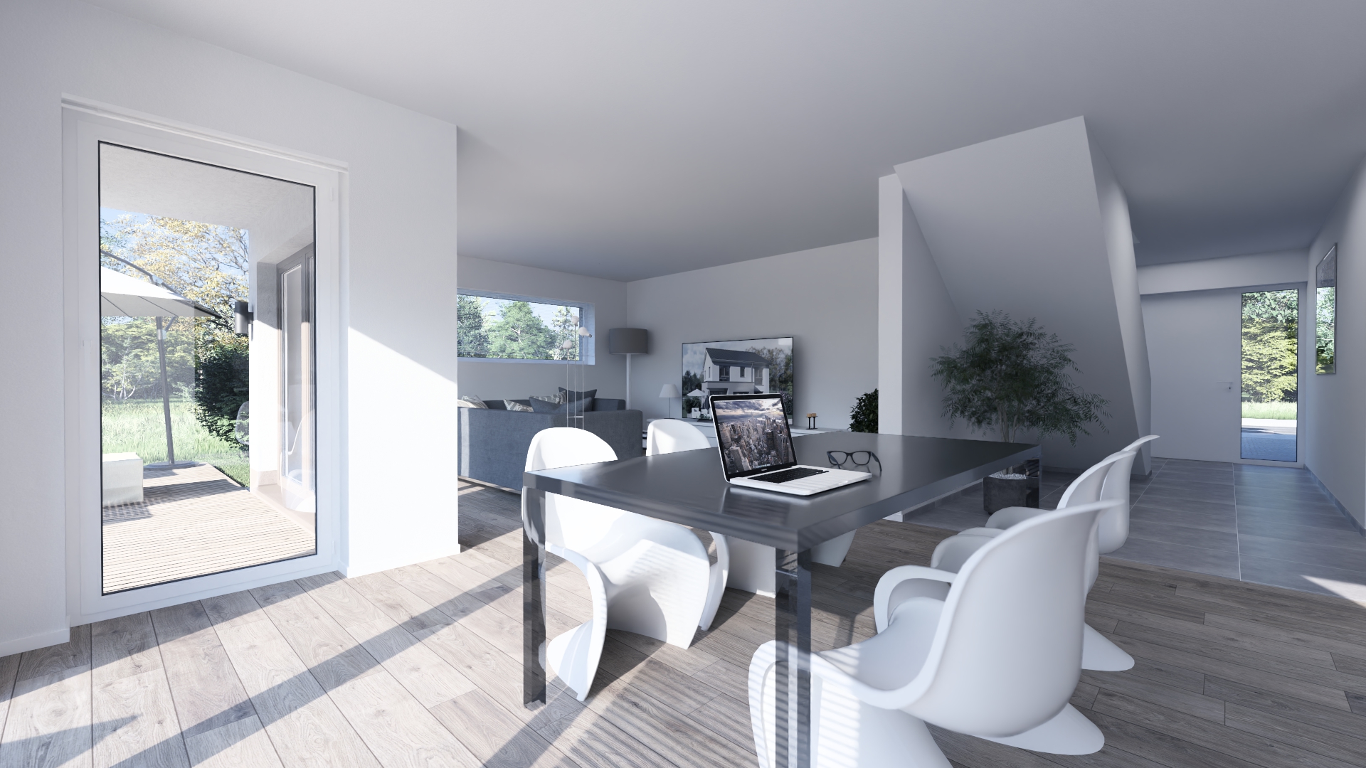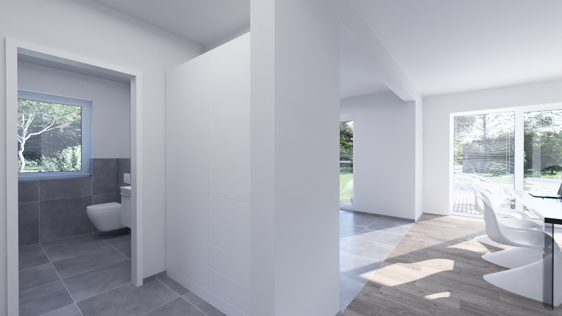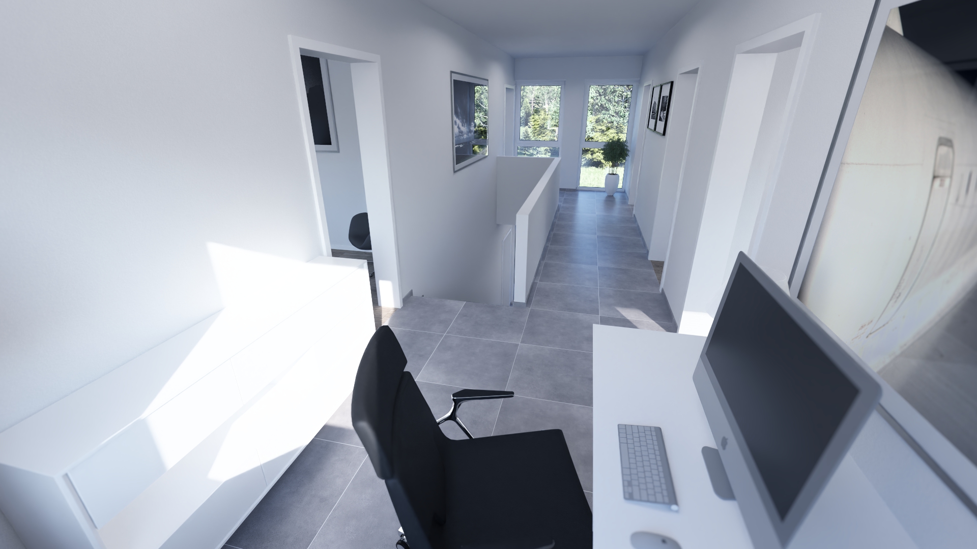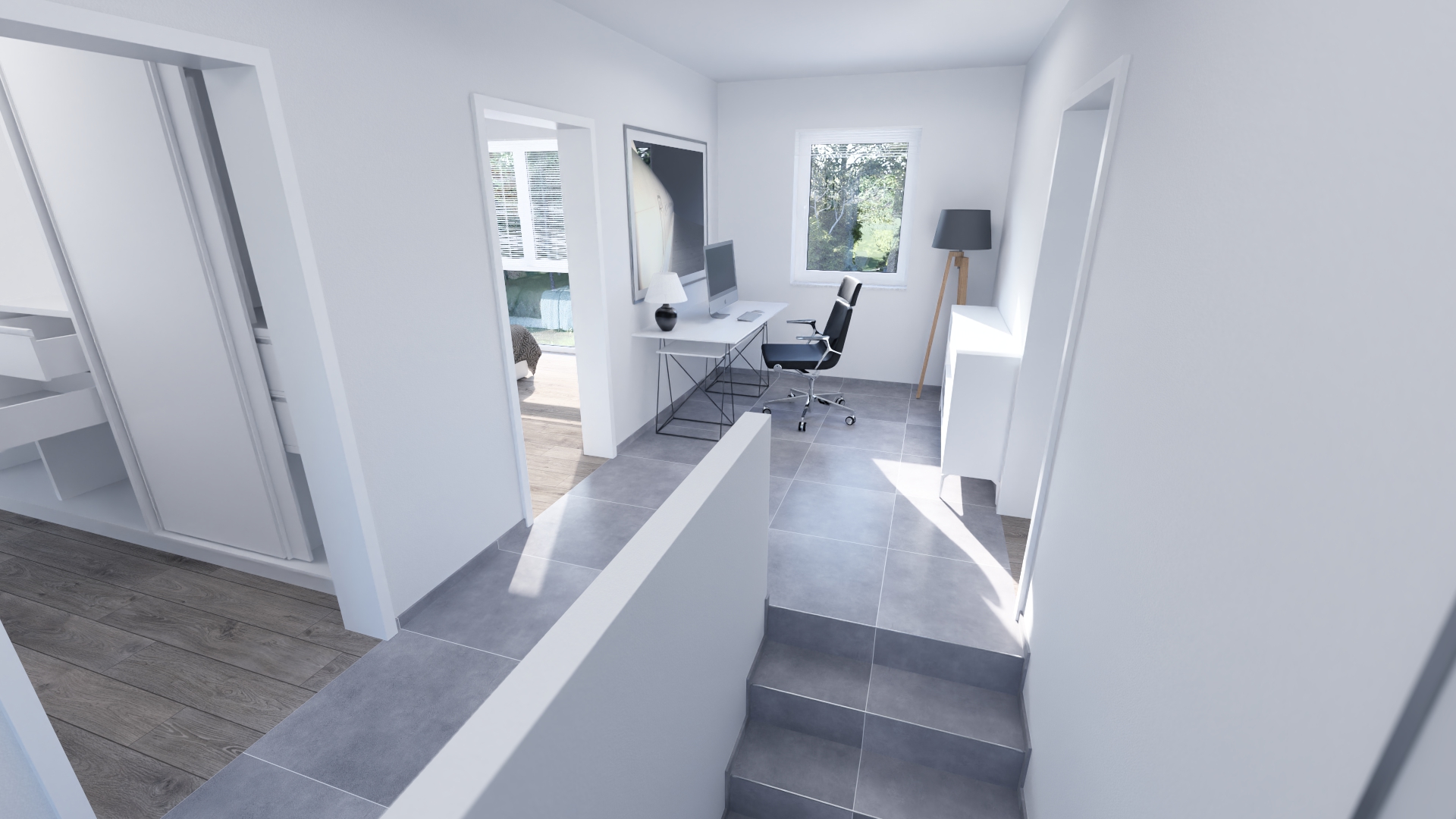 Im Open Space Büro im Obergeschoss können Sie in Ruhe arbeiten oder Ihrer Kreativität freien Lauf lassen. Auf der überdachten Terrasse mit direkten Zugang von Essbereich und Wohnzimmer gehen Komfort und Genuss nahtlos ineinander über.