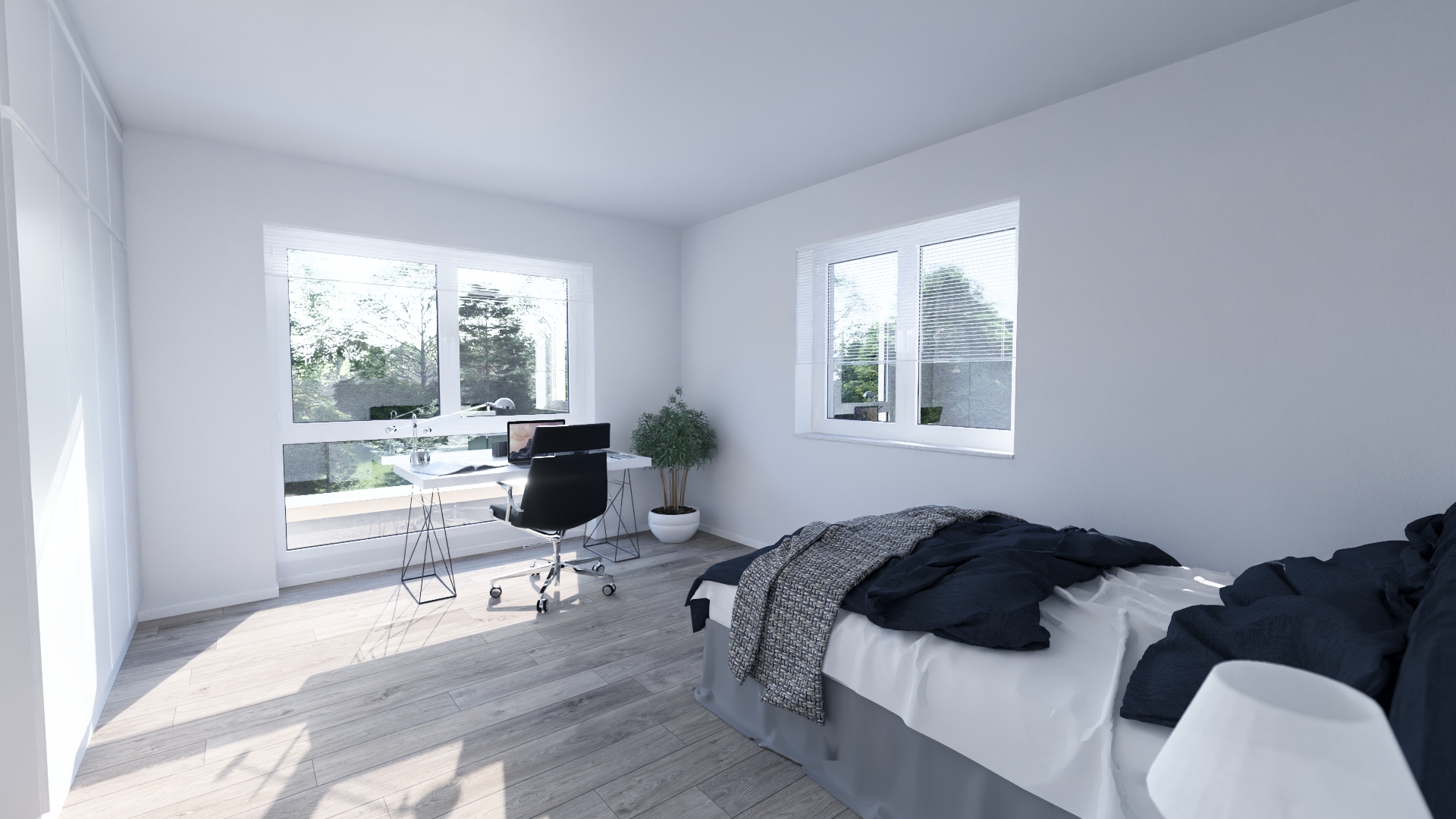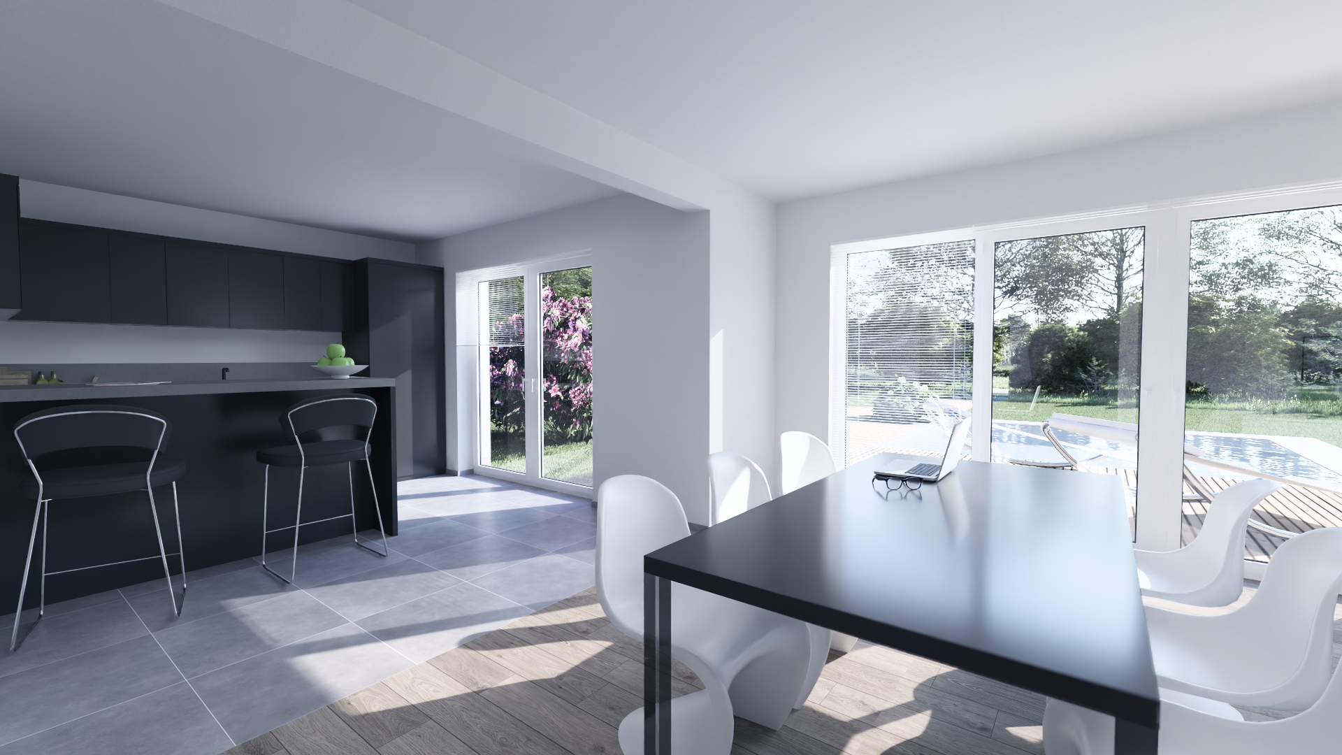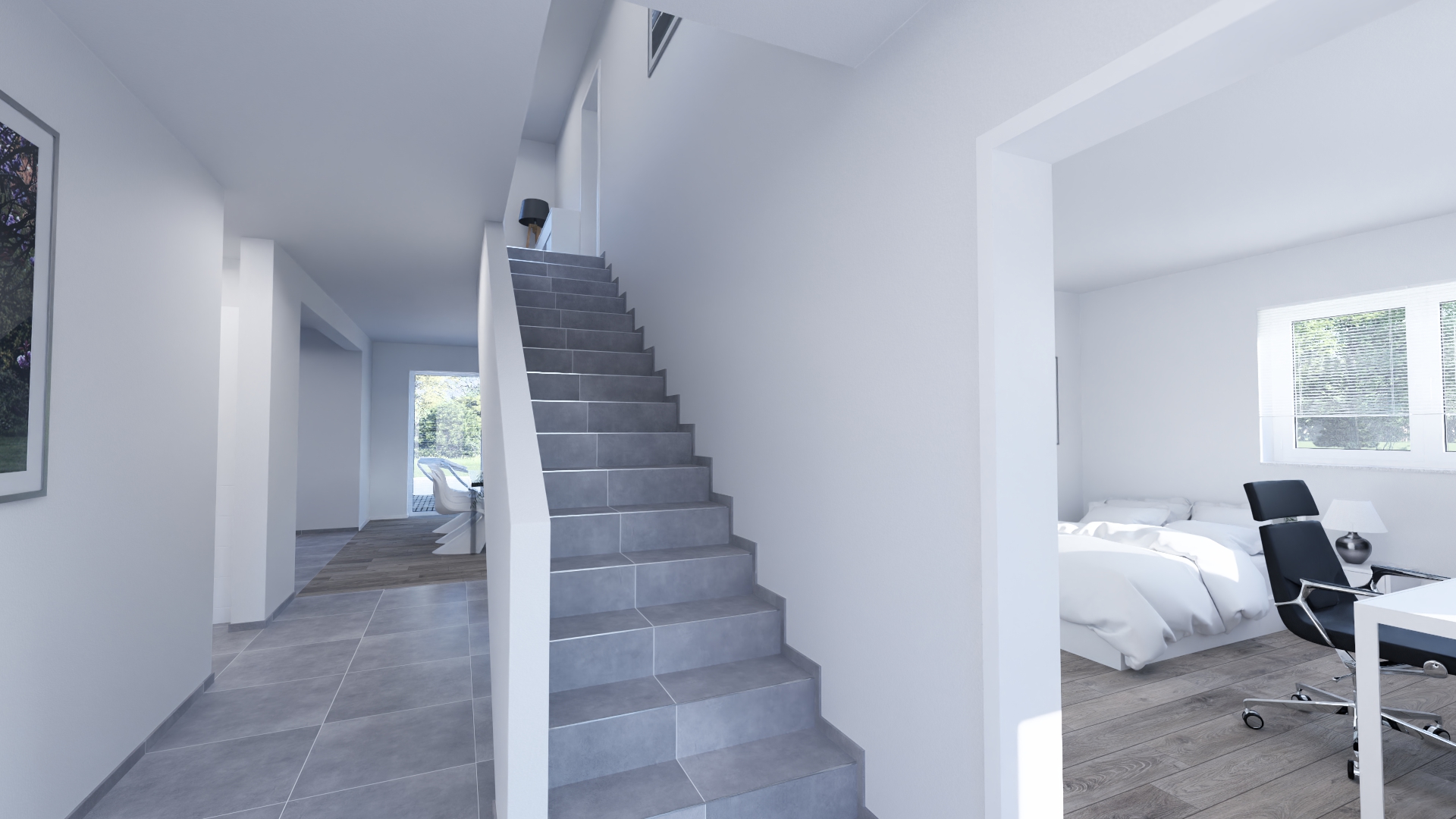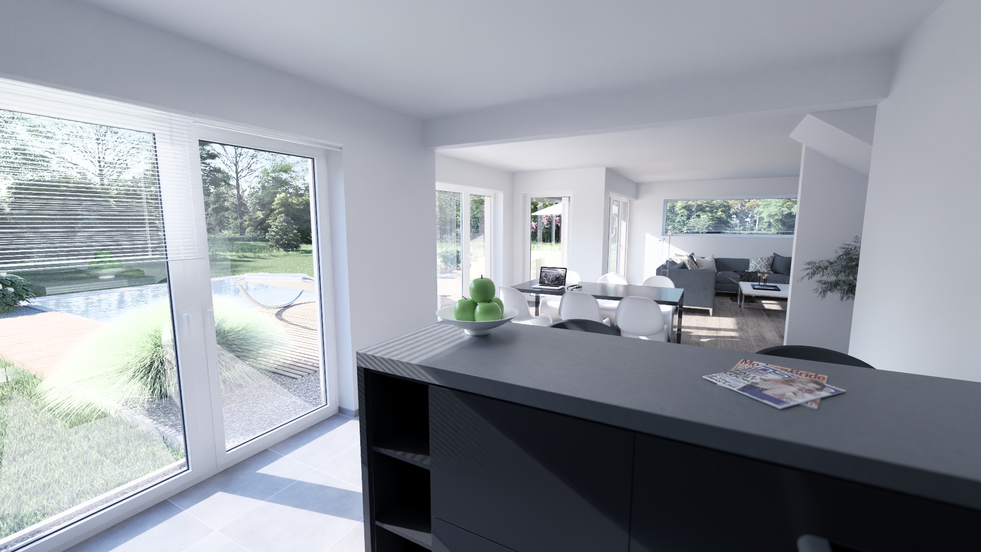 Im Open Space Büro im Obergeschoss können Sie in Ruhe arbeiten oder Ihrer Kreativität freien Lauf lassen. Auf der überdachten Terrasse mit direkten Zugang von Essbereich und Wohnzimmer gehen Komfort und Genuss nahtlos ineinander über.