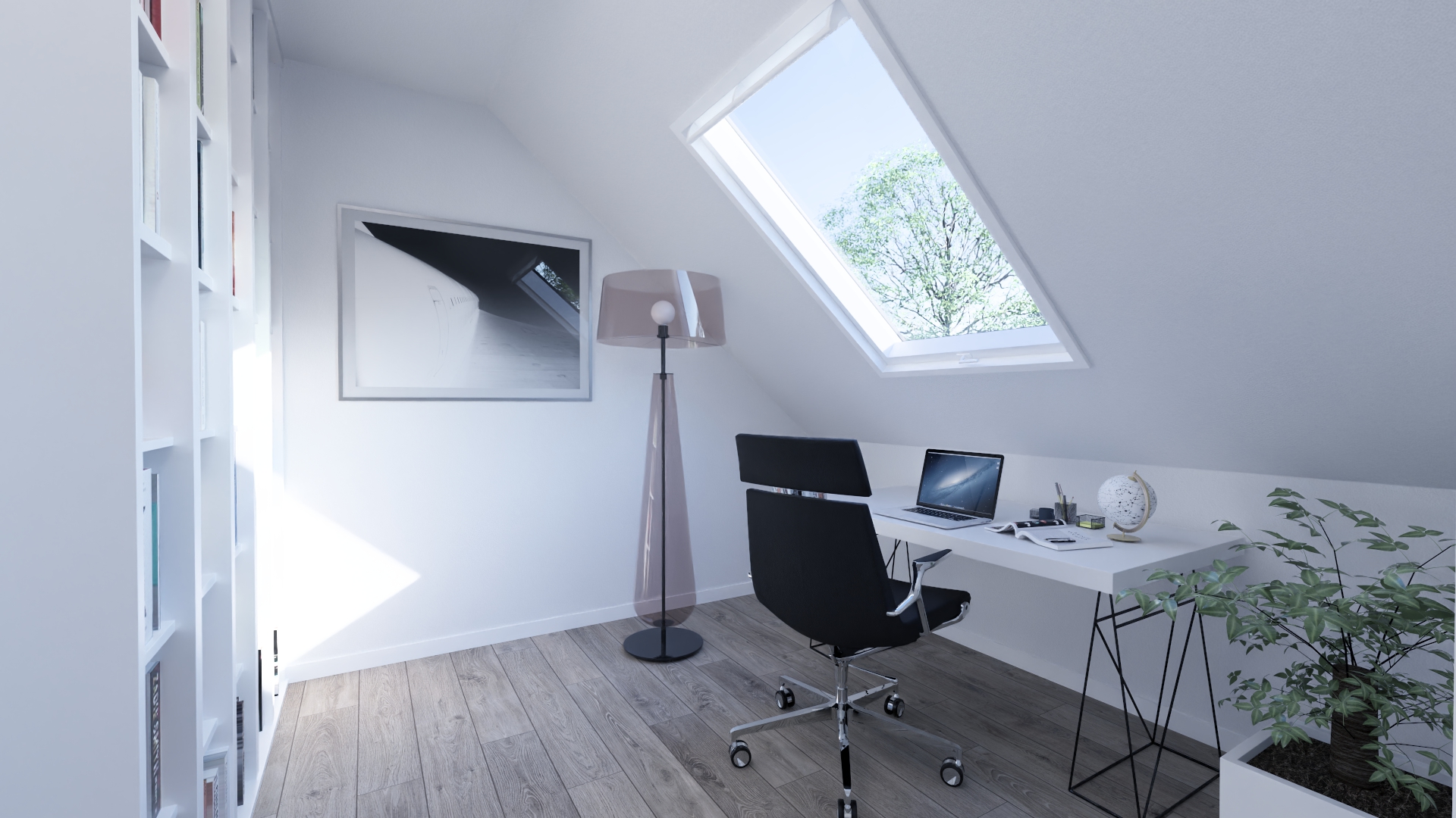Im praktisch aufgeteilten Dachgeschoss befindet sich neben zwei Schlafräumen und Familienbadezimmer das Büro mit Dachflächenfenster – arbeiten unter den Sternen.