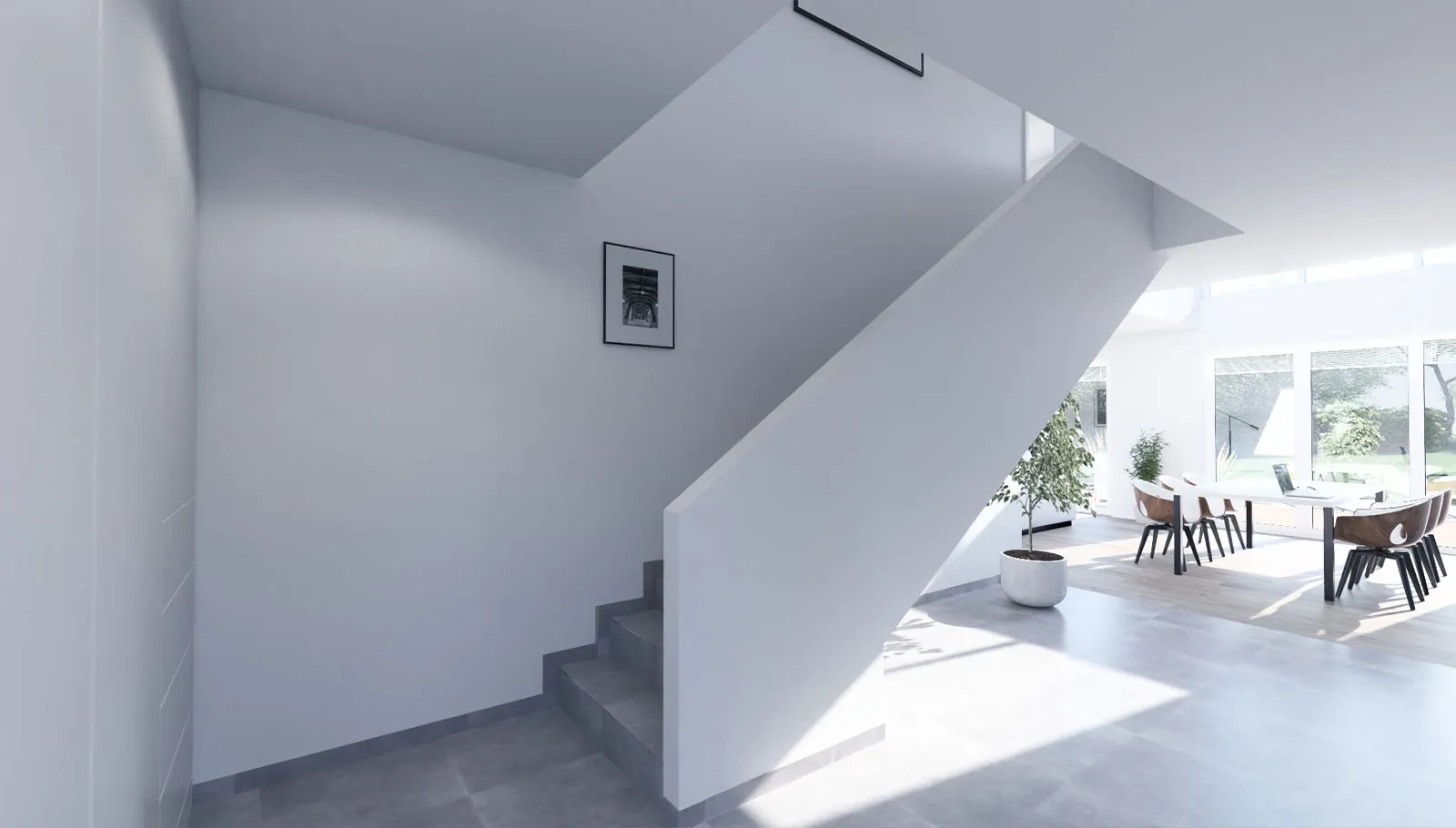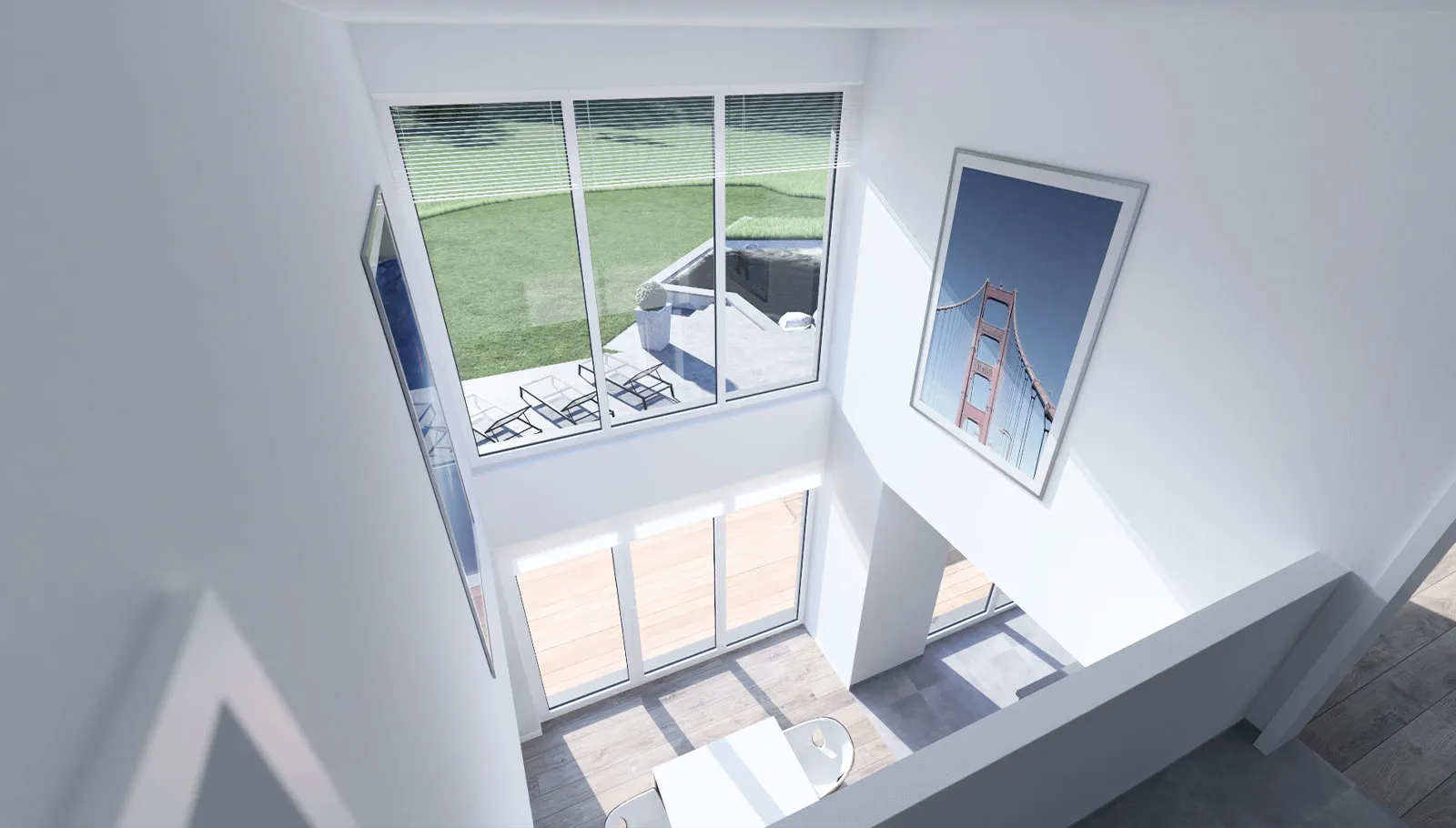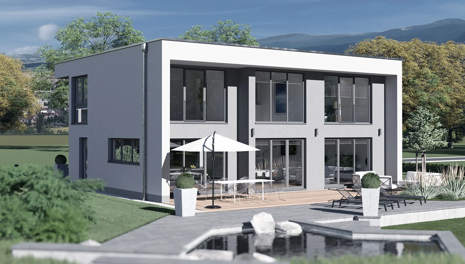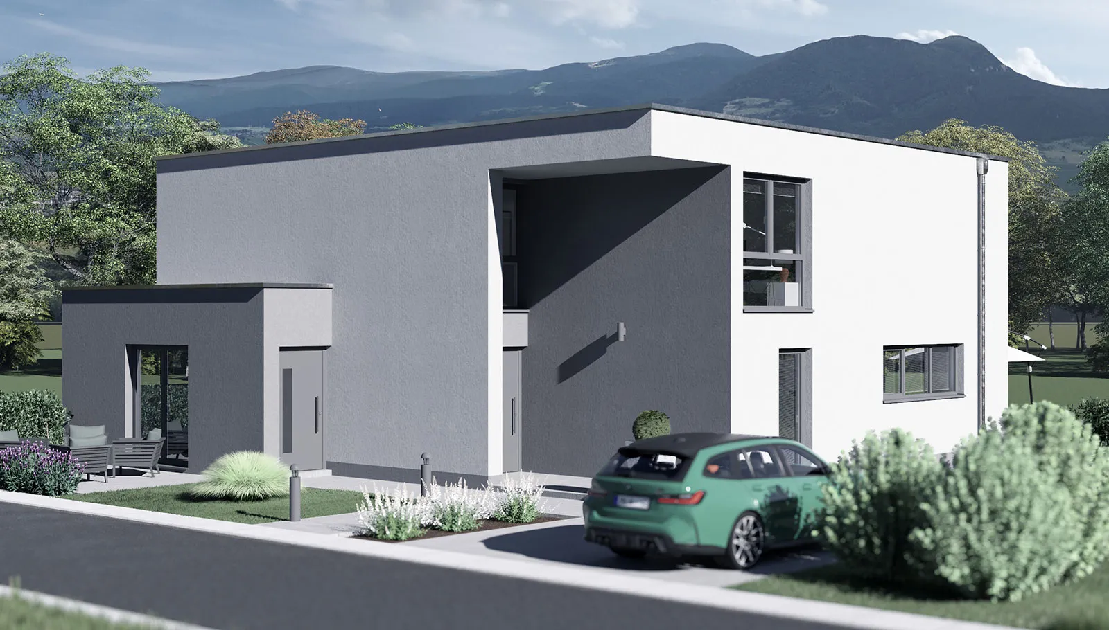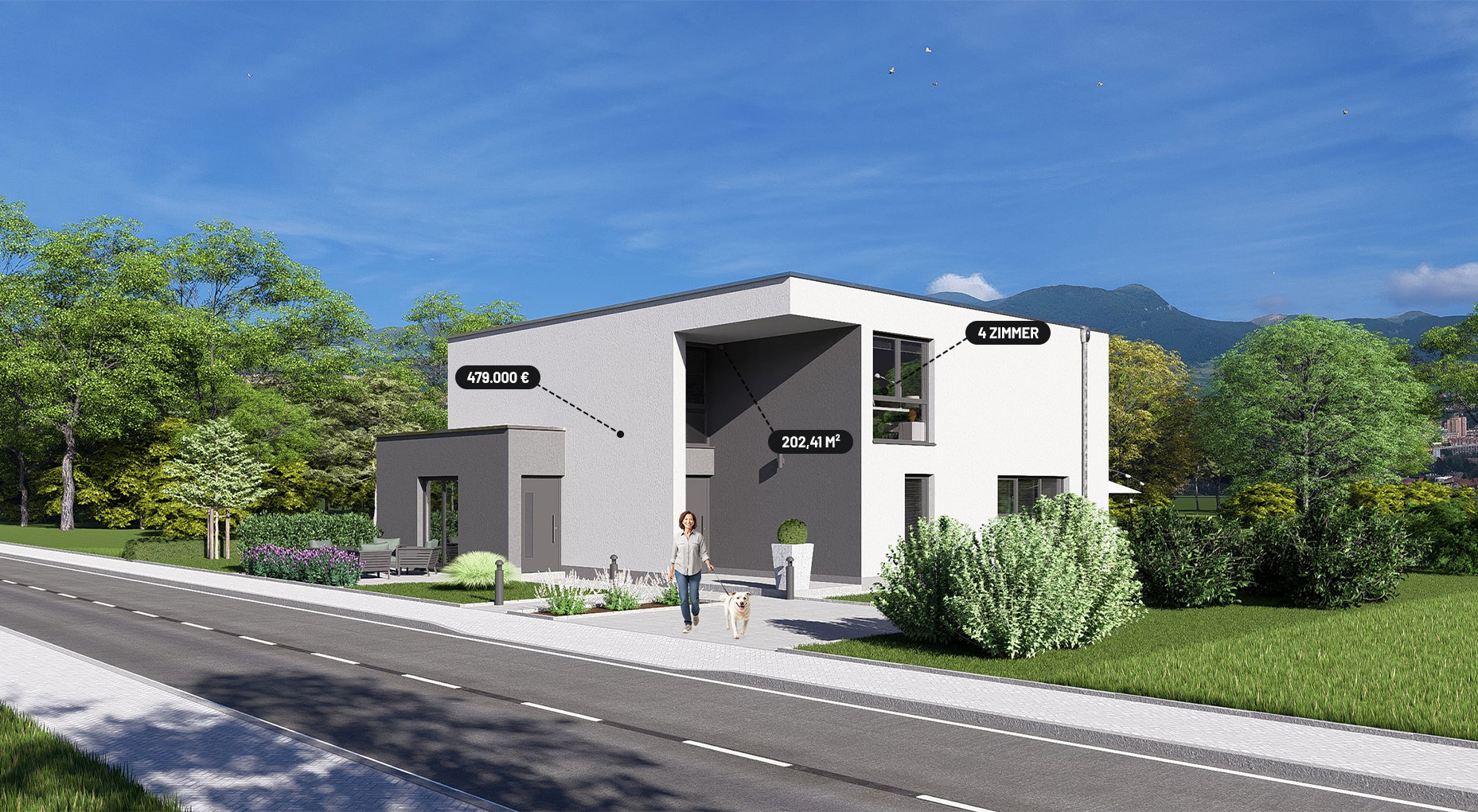 Ein Highlight ist die offene Galerie mit beeindruckender Fensterfläche über zwei Ebenen, die für lichtdurchflutete Räume sorgt. Der markante Dachüberstand garantiert eine angenehme Beschattung der Rückseite, während die großflächigen Fenster den Blick ins Grüne eröffnen. Der im 2. Obergeschoss überdachte Eingangsbereich verleiht dem Haus den Charme einer Hollywood-Villa. „MODERN ART“ – ein Zuhause, das Stil und Komfort perfekt vereint.