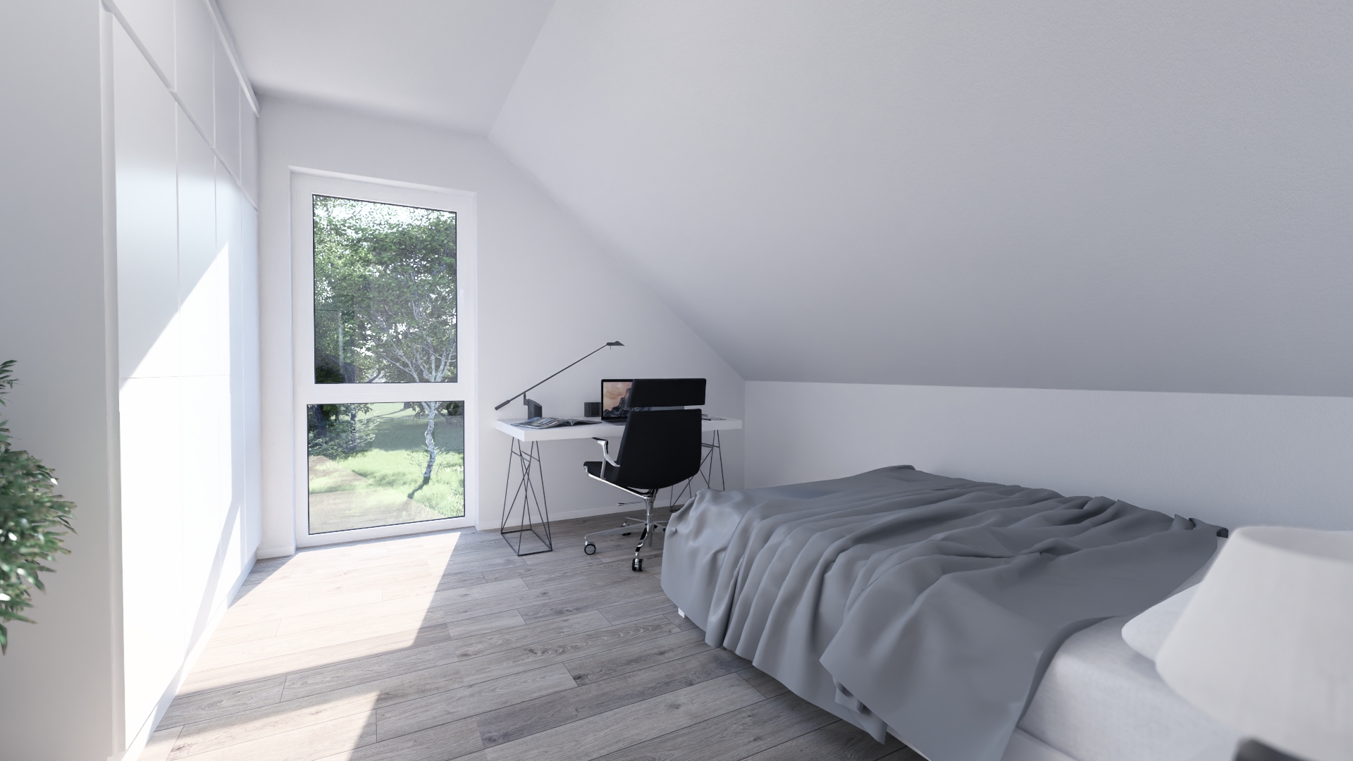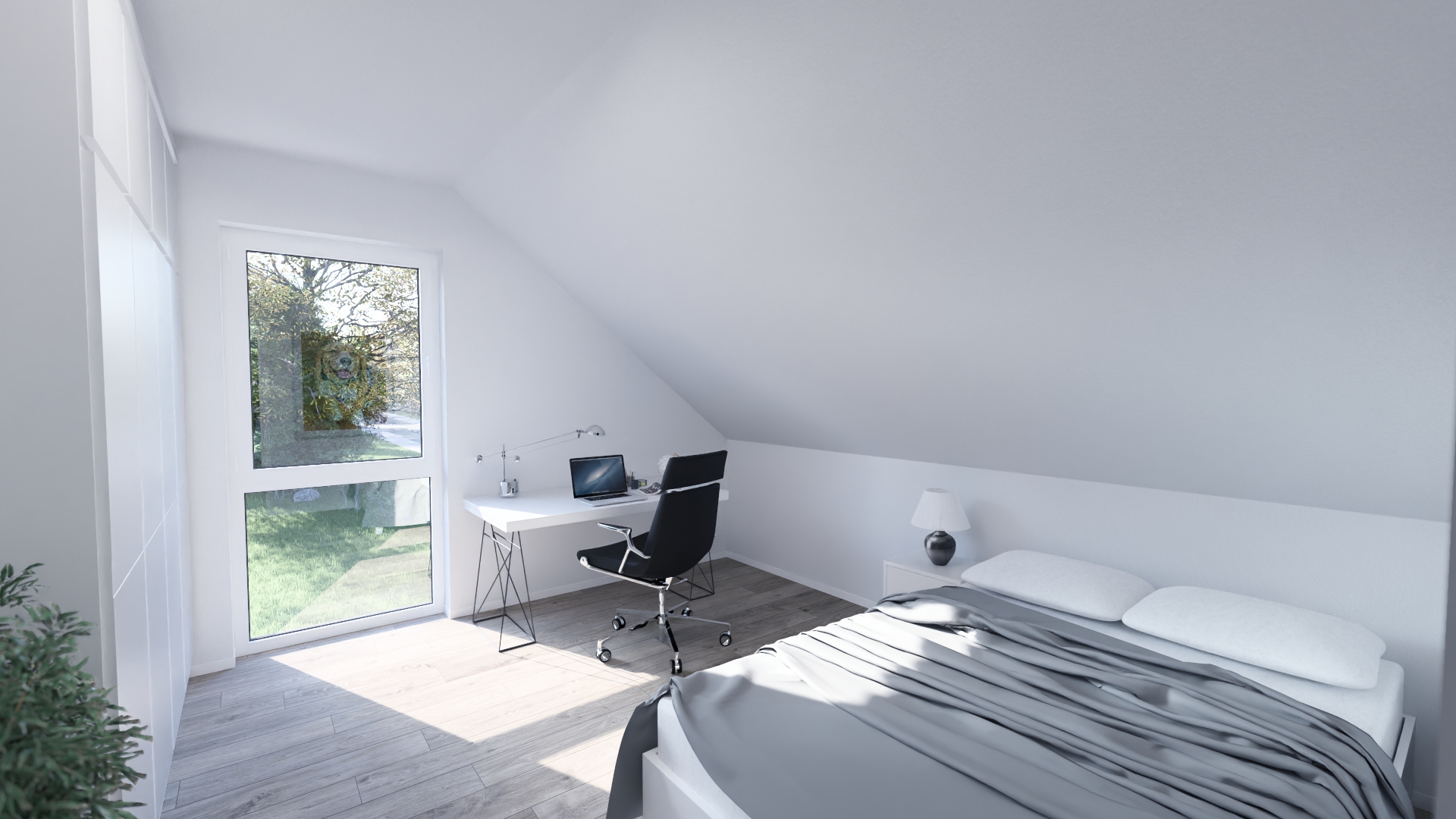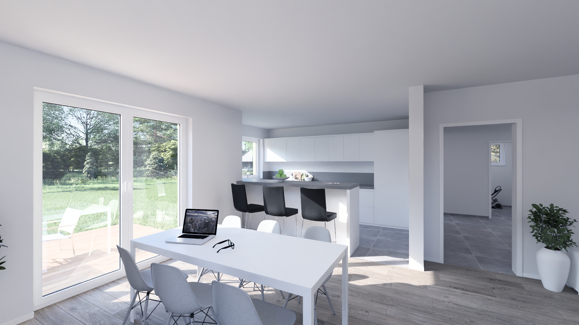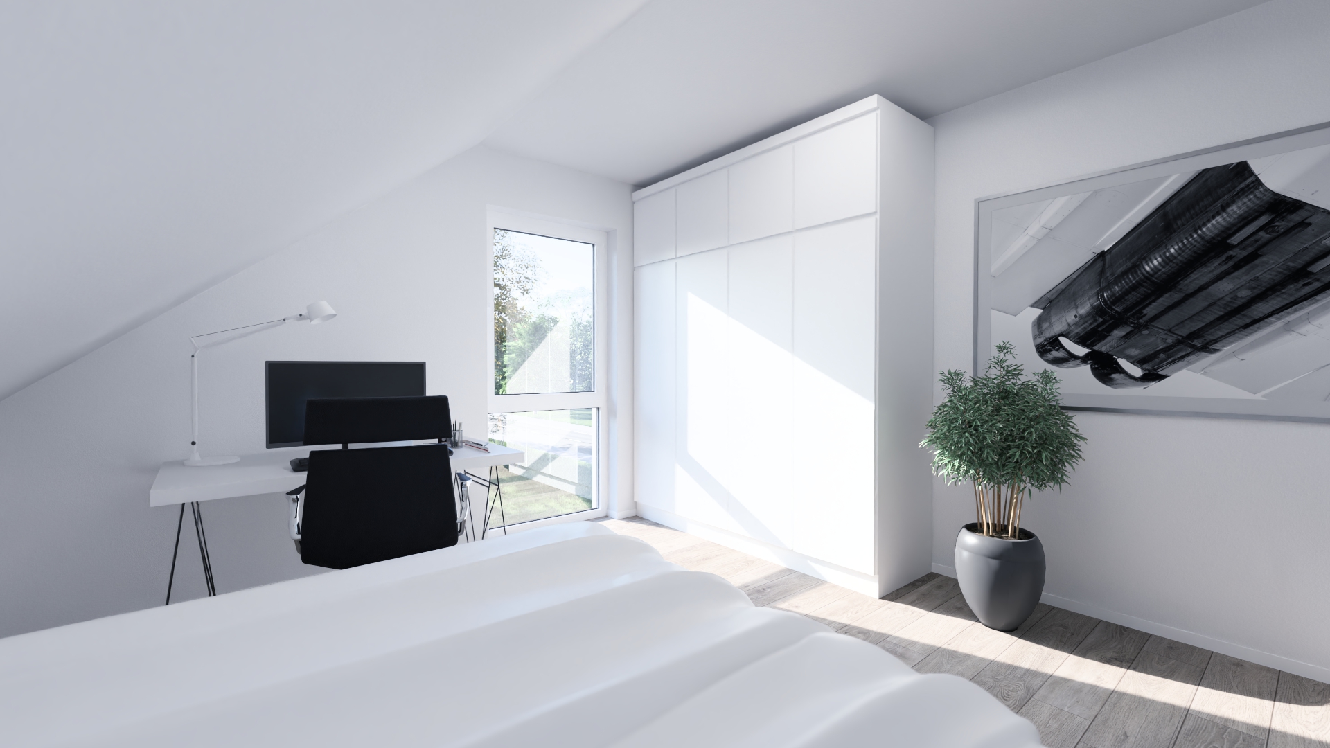 In den Erker eingebunden bildet die Küche das Zentrum des Familienlebens. Vom Wohn- und Essbereich aus blicken Sie durch die bodentiefen Fenster in den Garten. Auch im Dachgeschoss sorgen vier bodentiefe Fenster für strahlende Helligkeit.