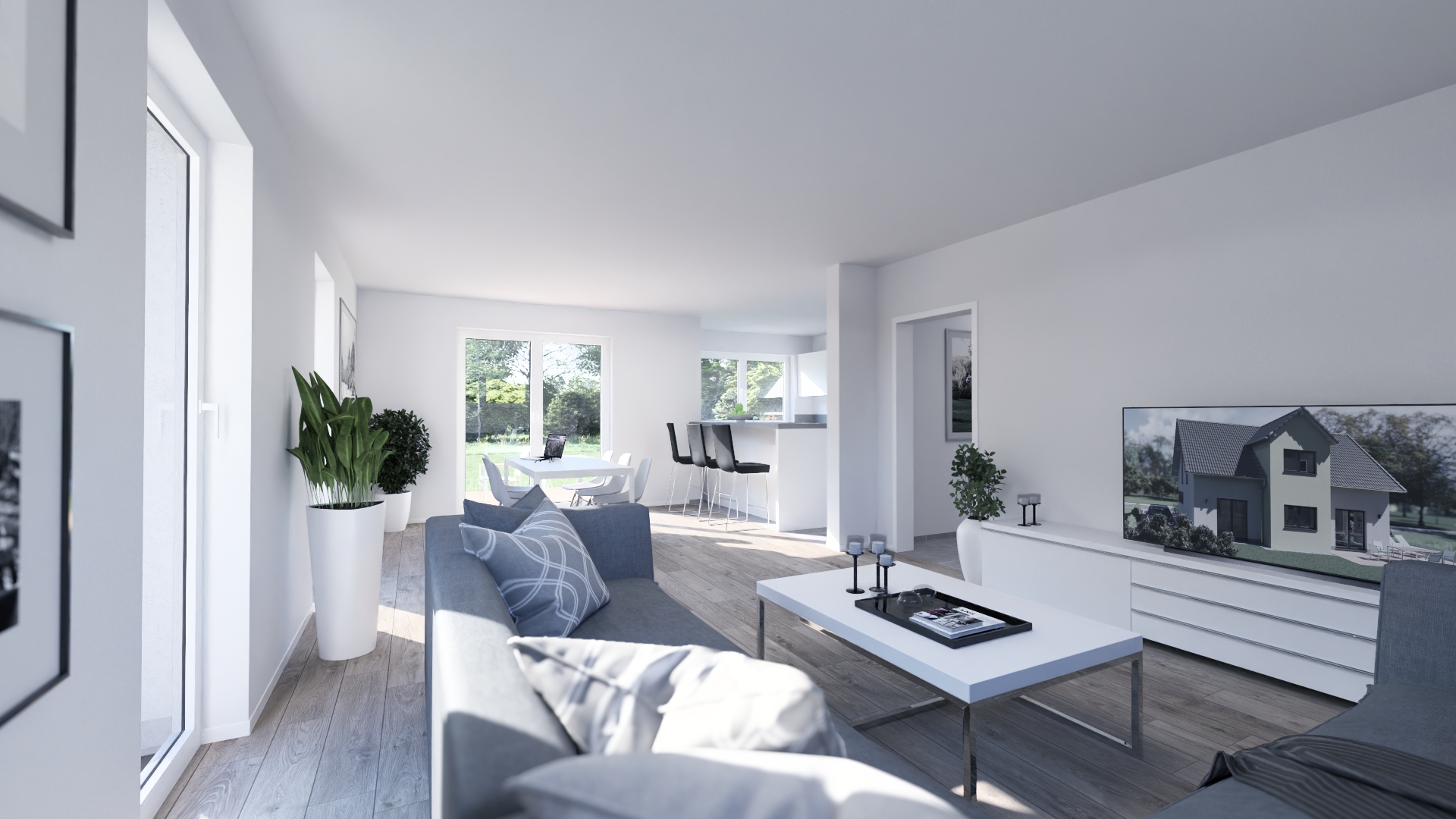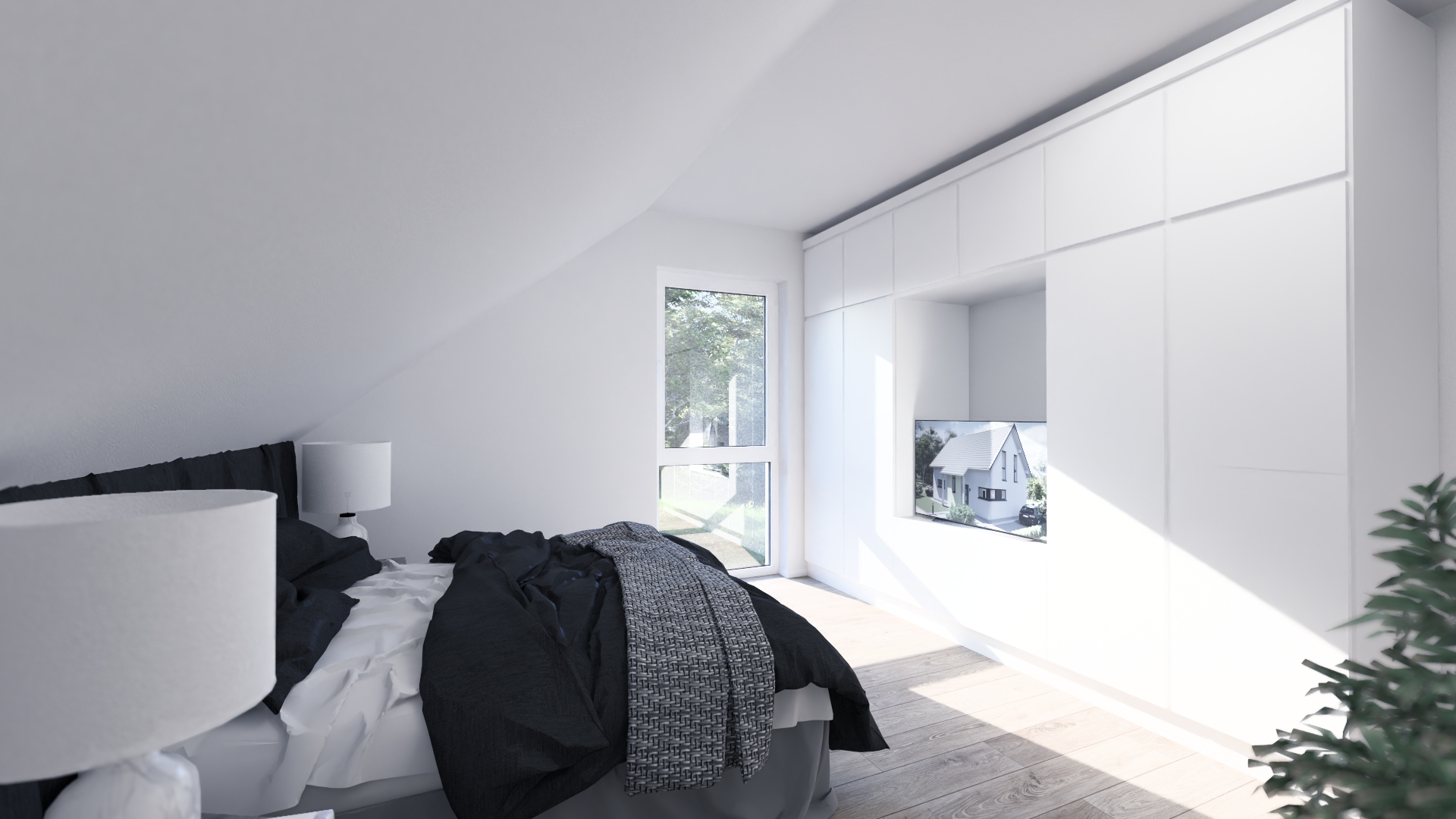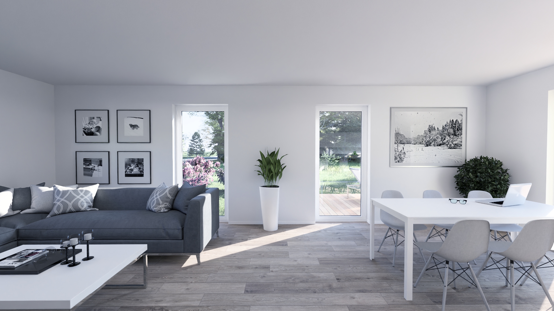 In den Erker eingebunden bildet die Küche das Zentrum des Familienlebens. Vom Wohn- und Essbereich aus blicken Sie durch die bodentiefen Fenster in den Garten. Auch im Dachgeschoss sorgen vier bodentiefe Fenster für strahlende Helligkeit.