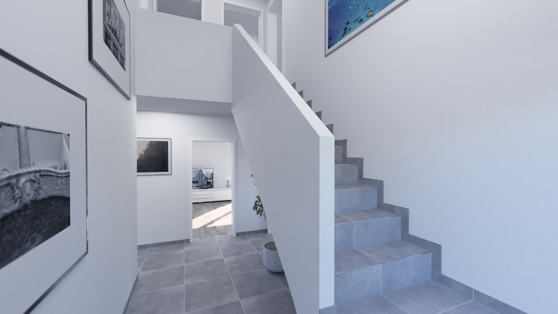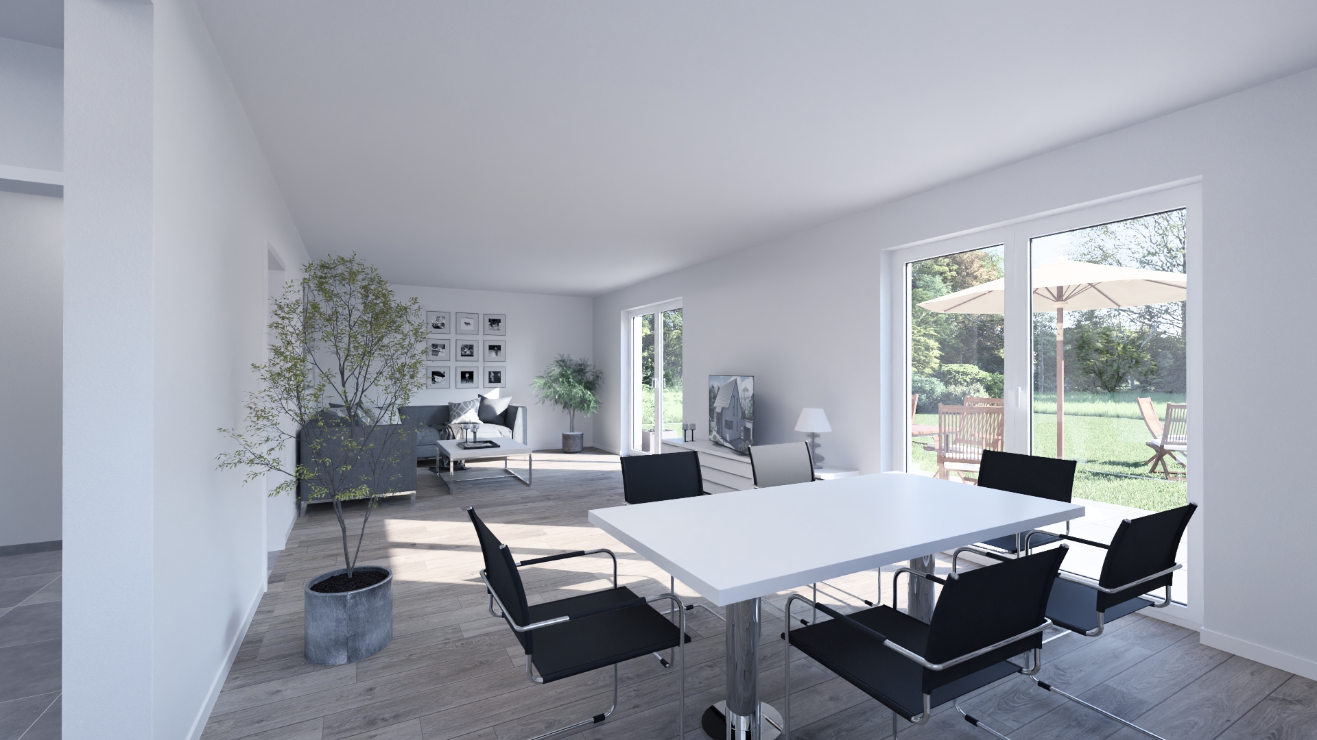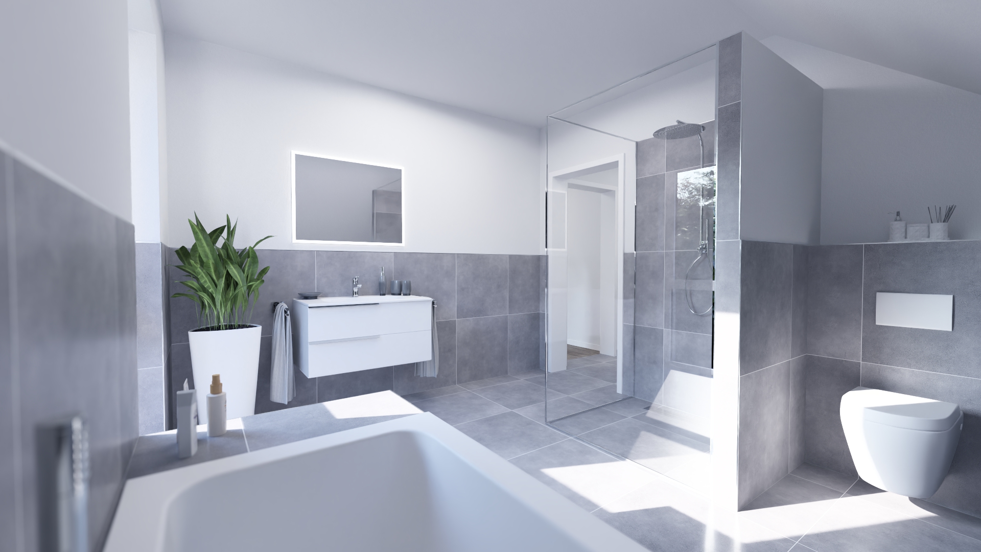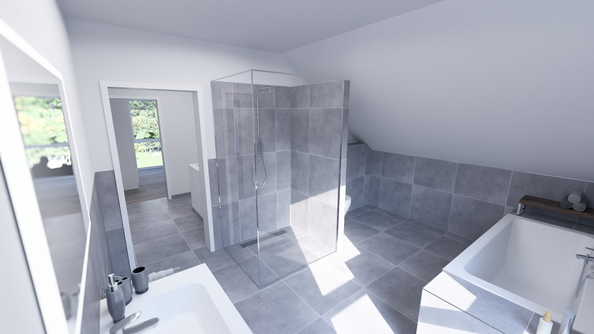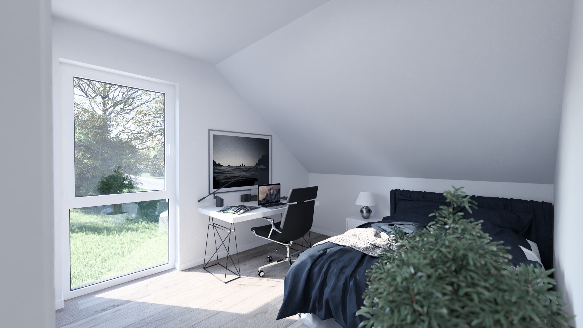 Der große Wohn- und Essbereich öffnet sich auf seiner gesamten Breite zur Terrasse und zum Garten hin. Das Dachgeschoss mit einem wohnlichen Bad überzeugt durch die gemütliche Schräge und die dadurch entstehende Wohlfühlatmosphäre für die gesamte Familie.