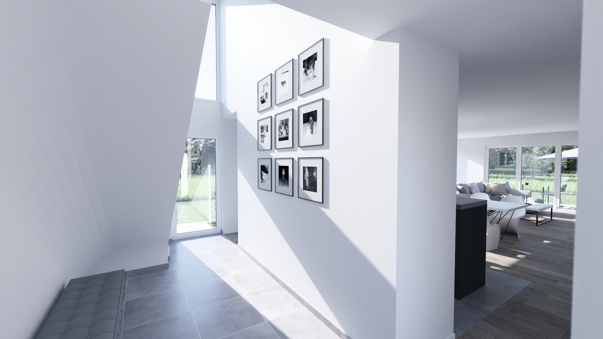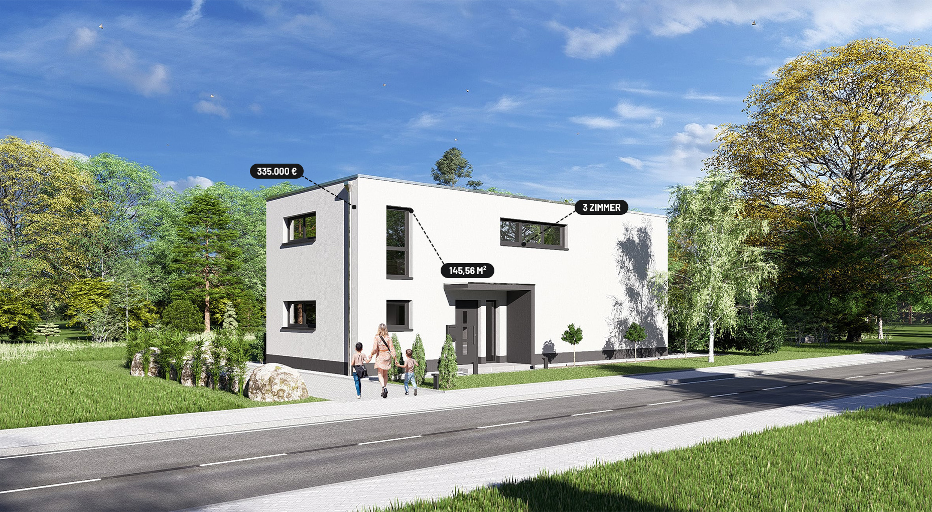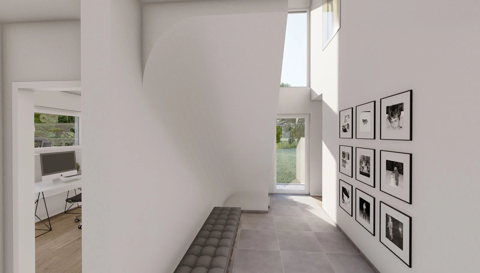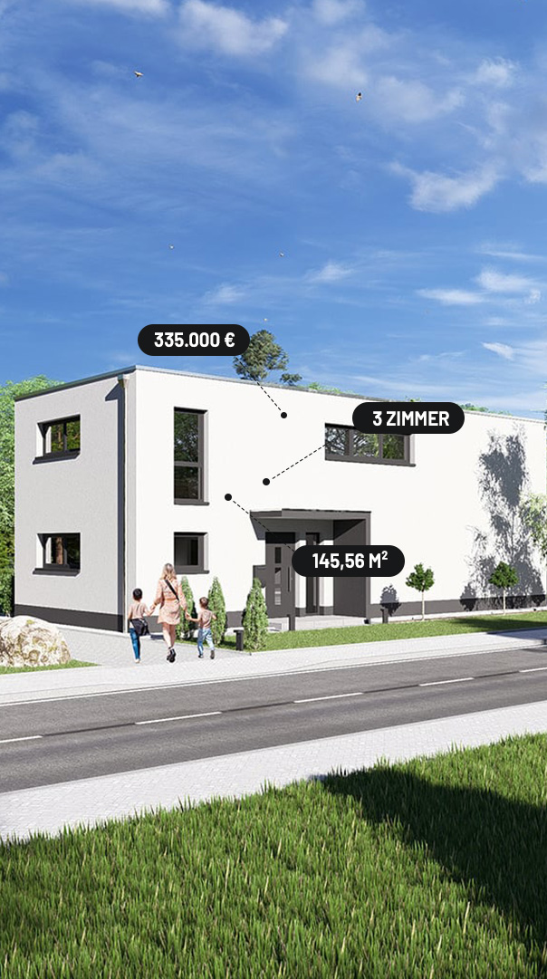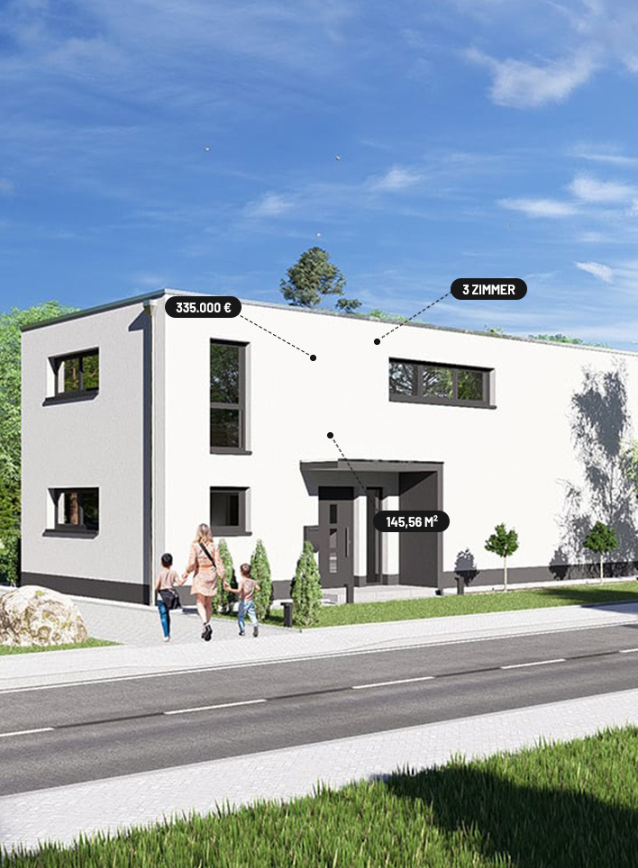 Slim wird Sie überraschen. Die moderne Architektur im Bauhausstil entfaltet erst im Inneren Ihre wahre Größe. Dieser Entwurf ist bis ins kleinste Detail durchdacht und verschwendet keinen Zentimeter Wohnraum. Lichtdurchflutete Räume und ein offenes Erdgeschoss, das mit der Kombination aus Küche, Ess- und Wohnraum einen ganz persönlichen Lebensmittelpunkt schafft.