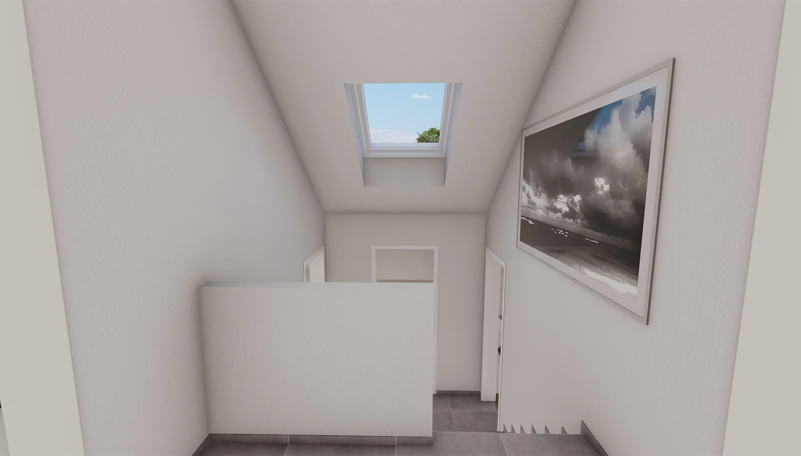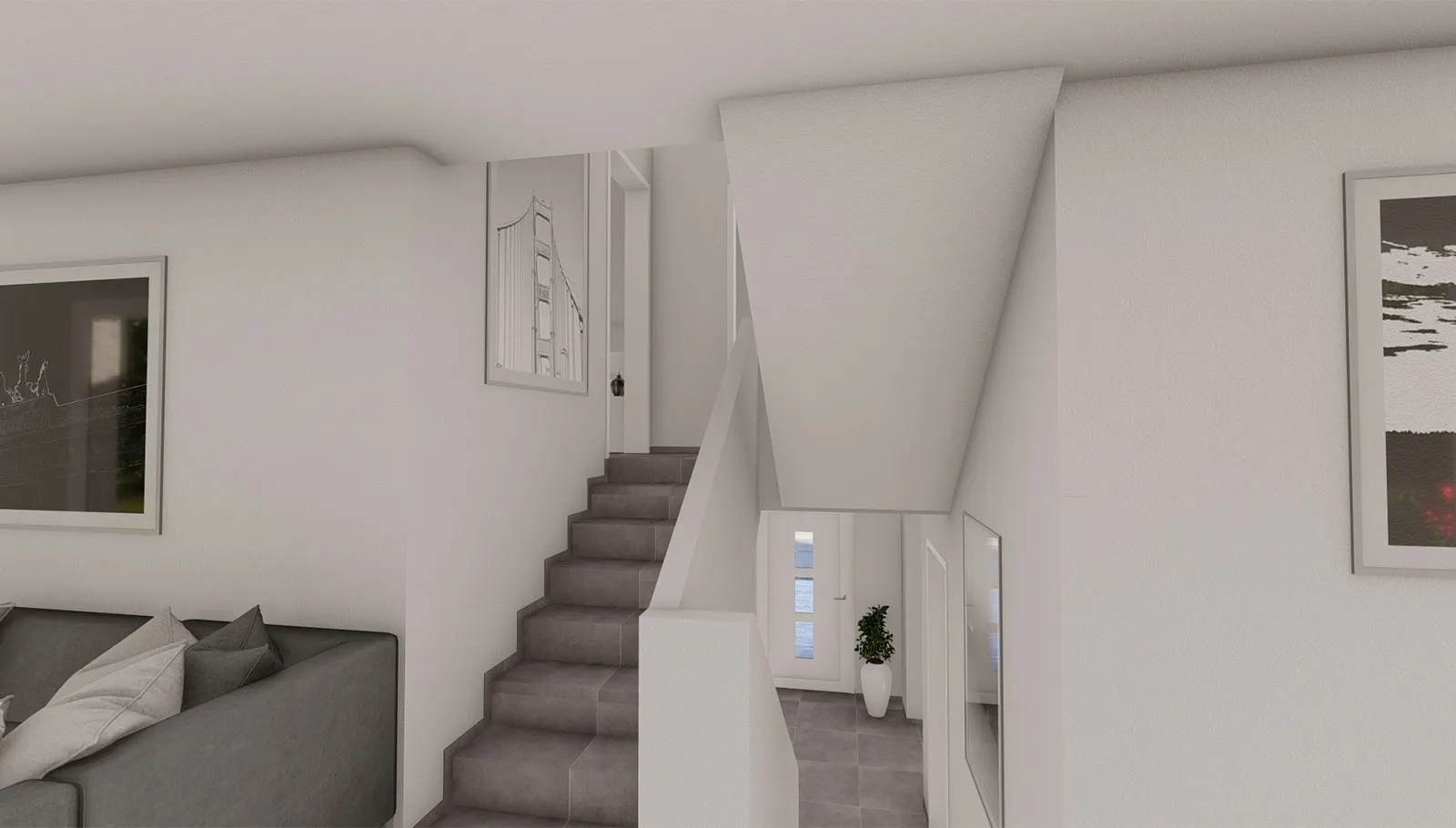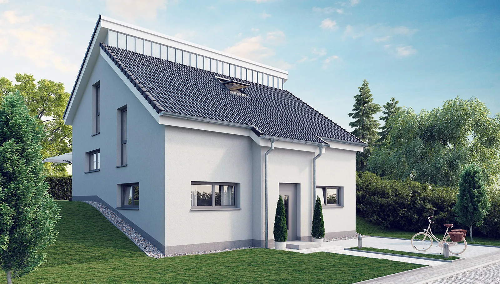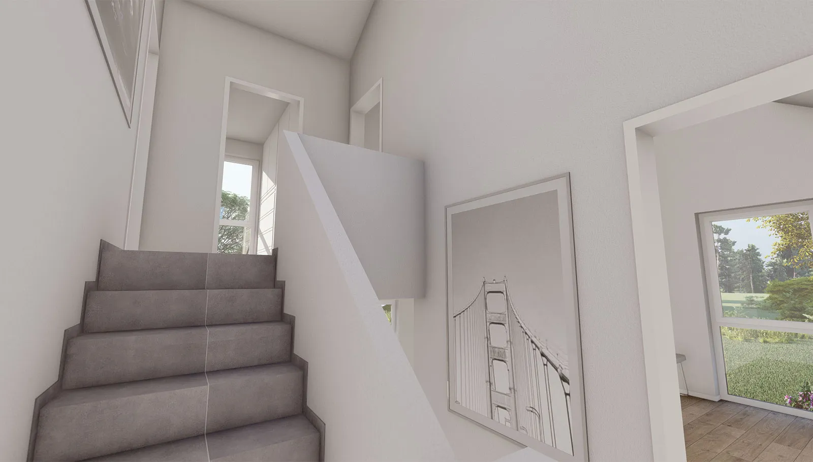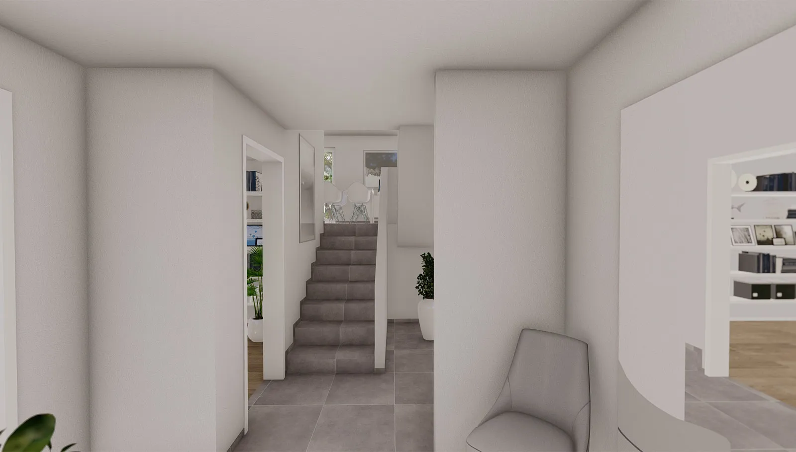 Die Split-Level-Architektur läßt den Wunsch vom Wohnen auf verschiedenen Ebenen wahr werden. Das Kernstück des Hauses bildet die Treppe, wodurch ein separates Treppenhaus entfällt. Der hohe Kniestock, eine optionale Teilunterkellerung und die große Gaube im OG schenken Ihnen genug Raum, Ihre Vorstellungen von den eigenen vier Wänden zu verwirklichen.