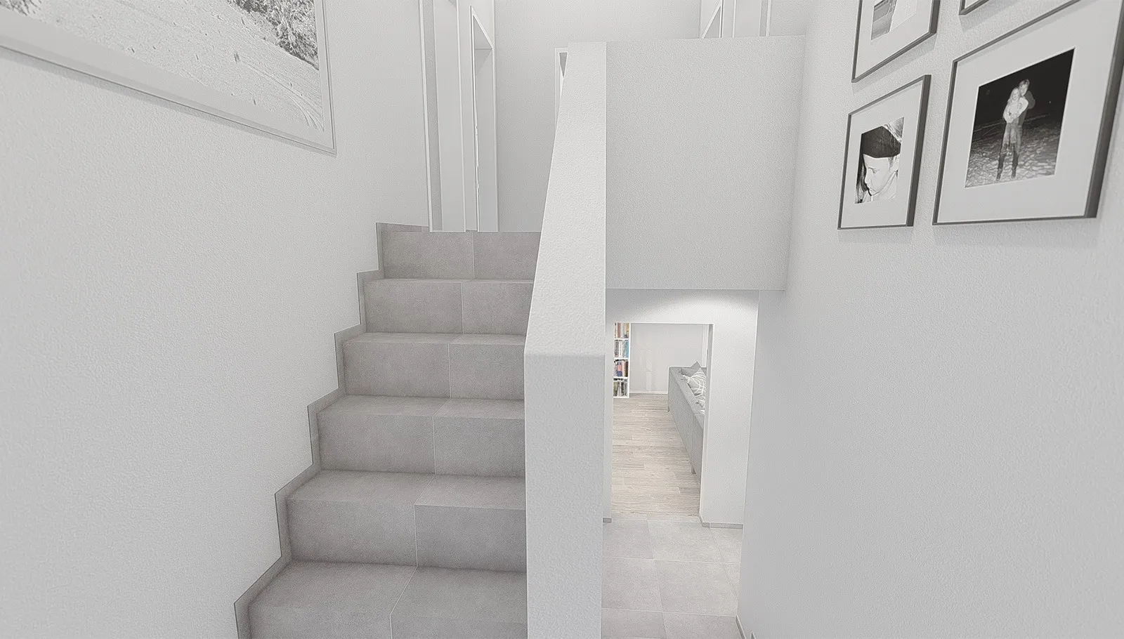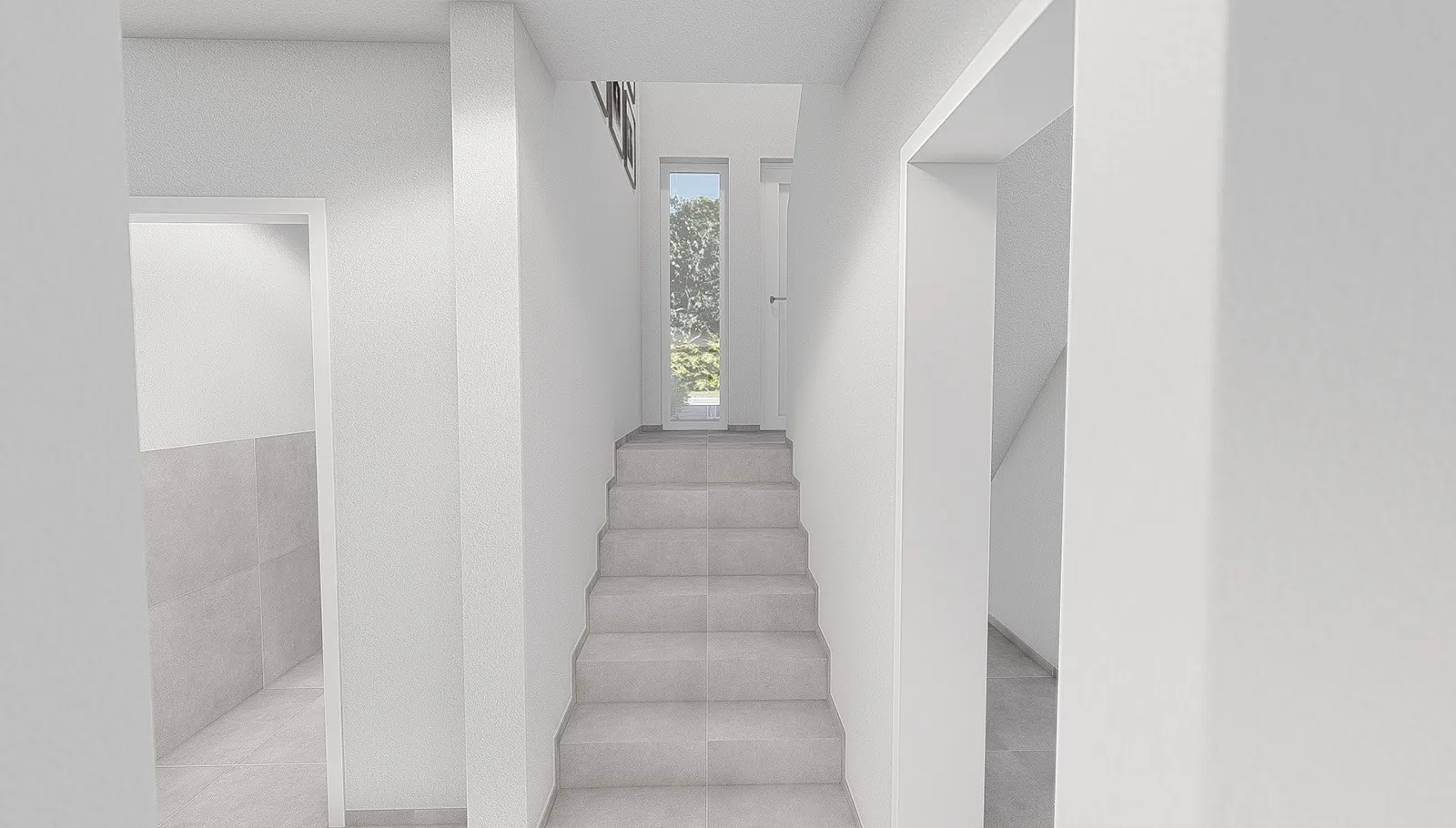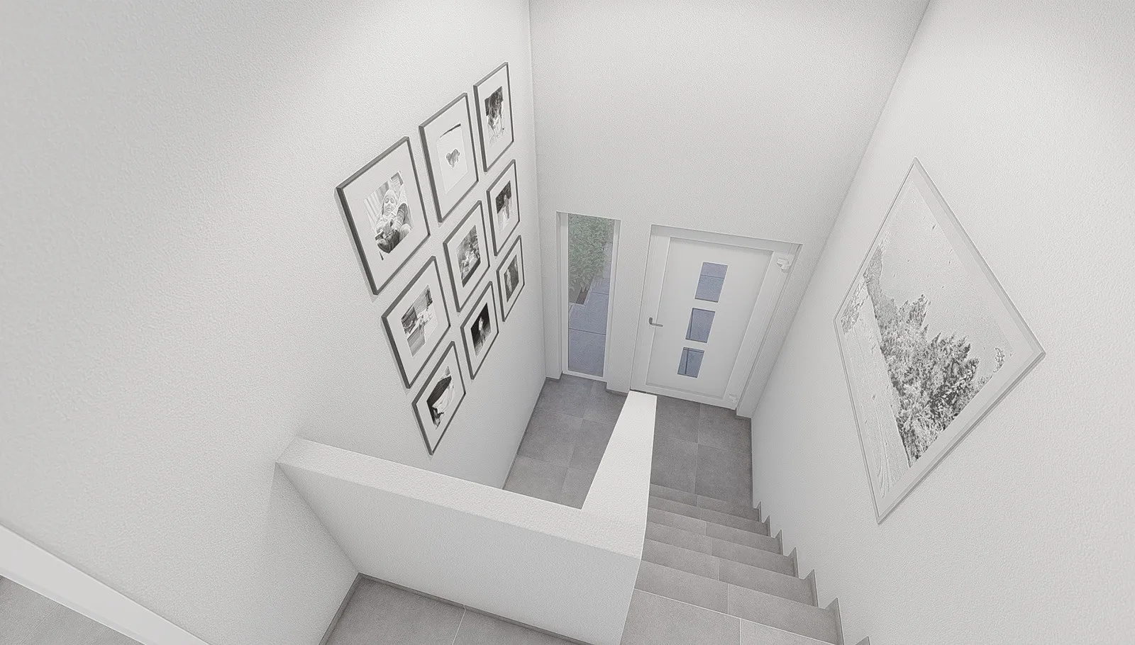 Der Eingangsbereich befindet sich auf einem Zwischenpodest. Von dort gehen Sie eine Ebene runter in den großzügigen Wohn- und Essbereich, der zusammen mit der offenen Küche fast die gesamte Fläche einnimmt.