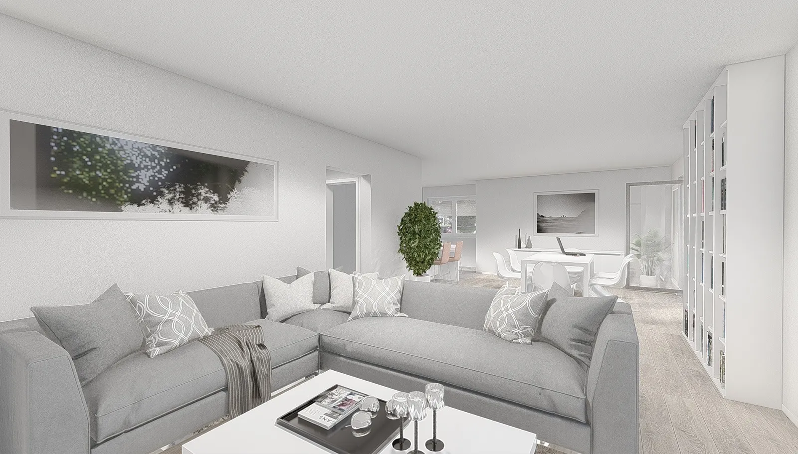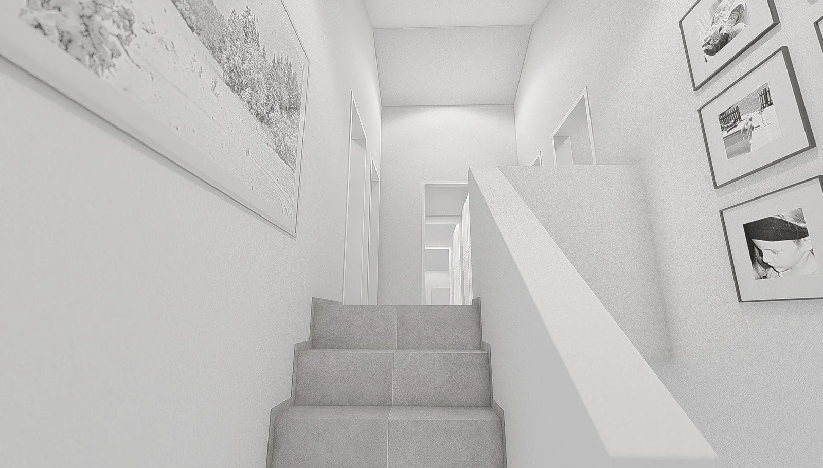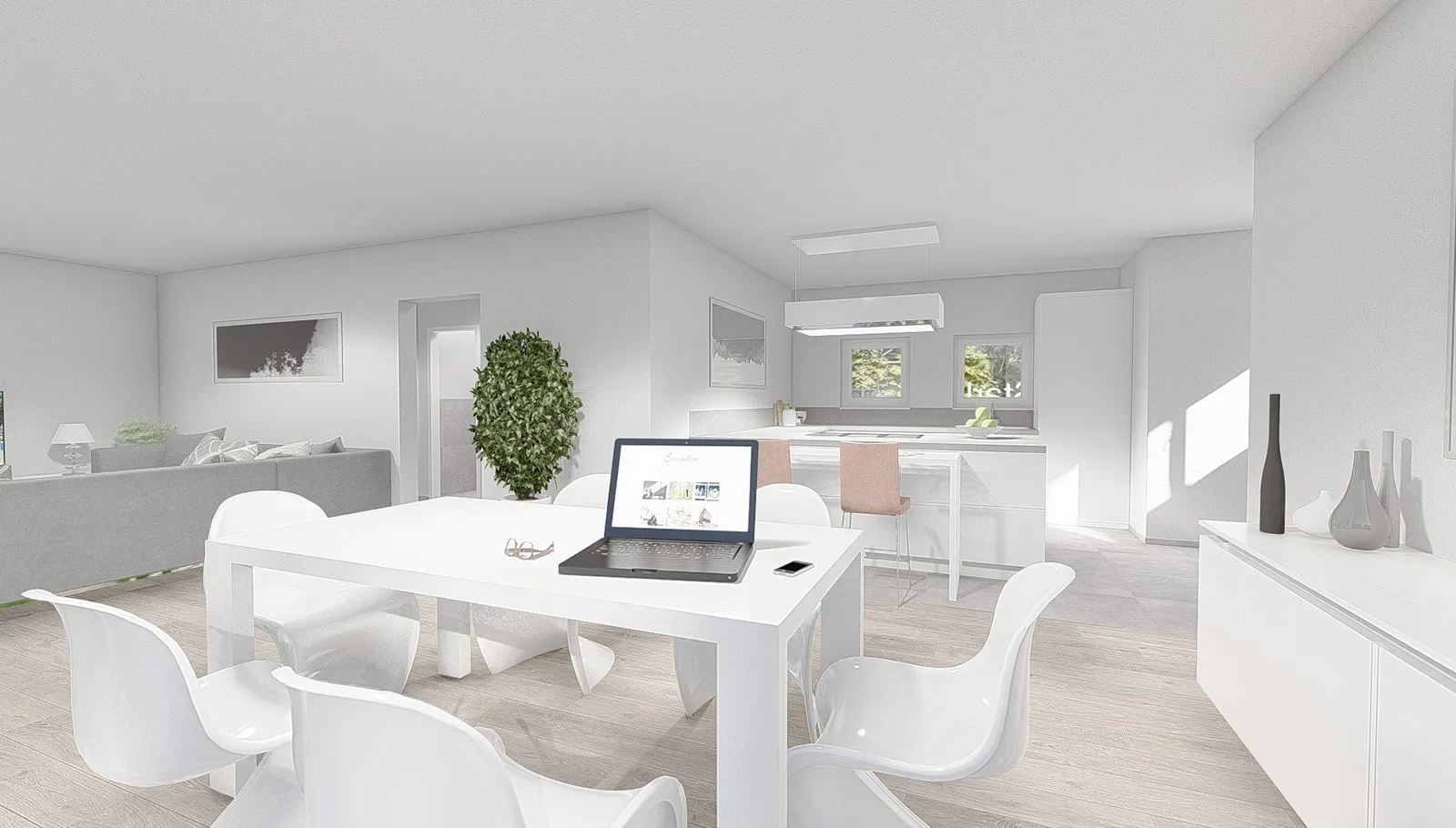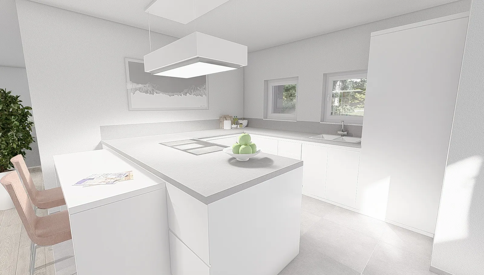 Der Eingangsbereich befindet sich auf einem Zwischenpodest. Von dort gehen Sie eine Ebene runter in den großzügigen Wohn- und Essbereich, der zusammen mit der offenen Küche fast die gesamte Fläche einnimmt.