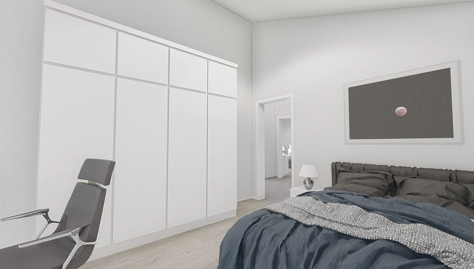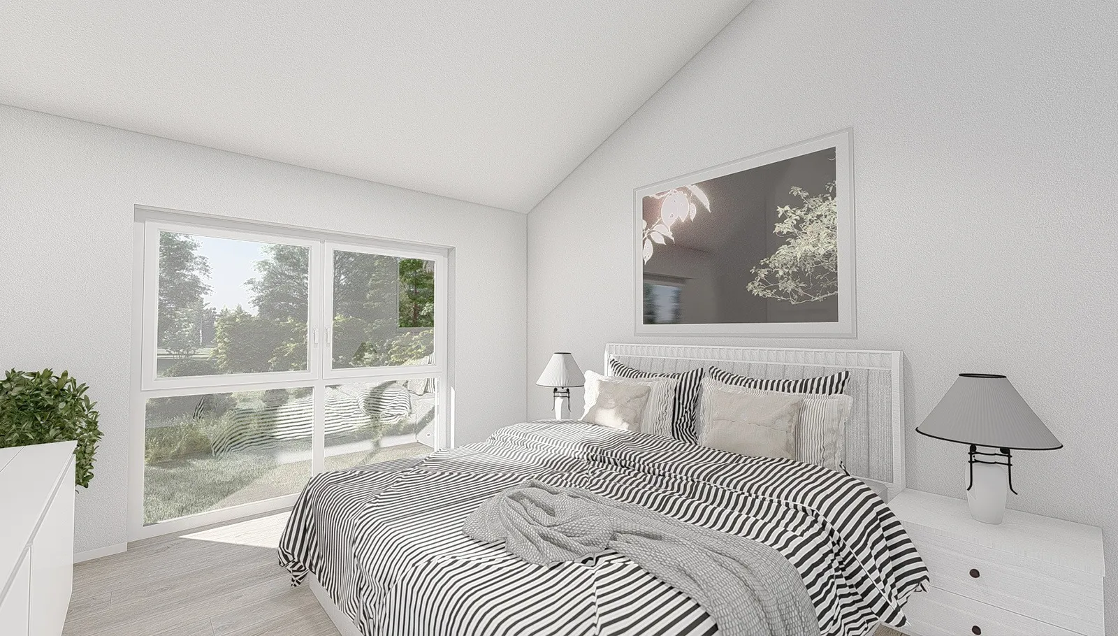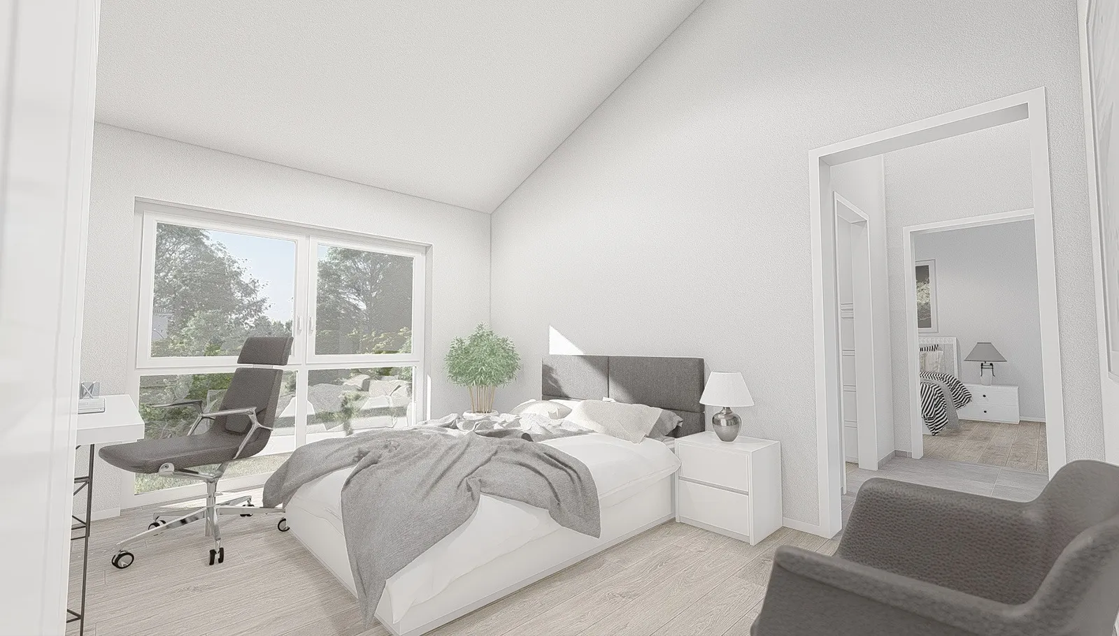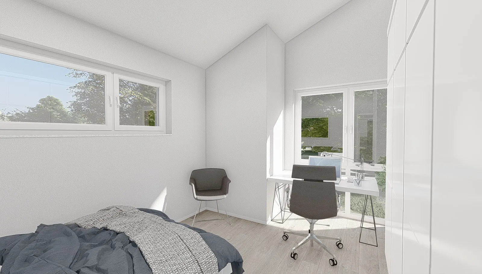 Das Dachgeschoss ist geprägt durch bodentiefe Fenster und lichte Raumhöhen bis in die Dachspitze.