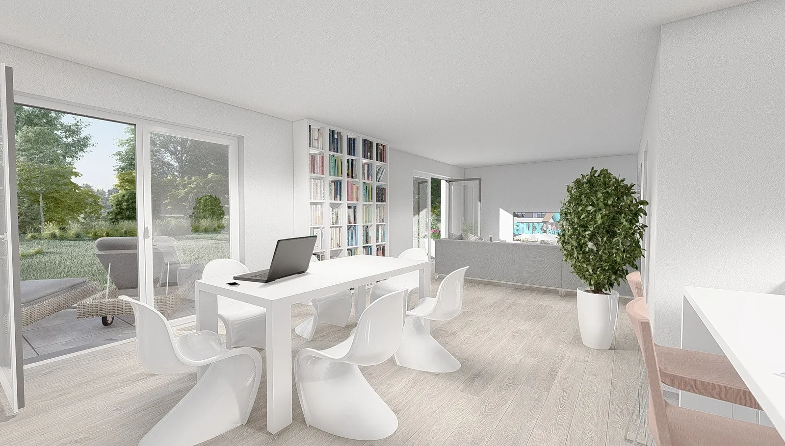 Bodentiefe, zweiteilige Fenster und Terrassentüren sorgen für helles, strahlendes Licht und öffnen den Blick in den Garten.